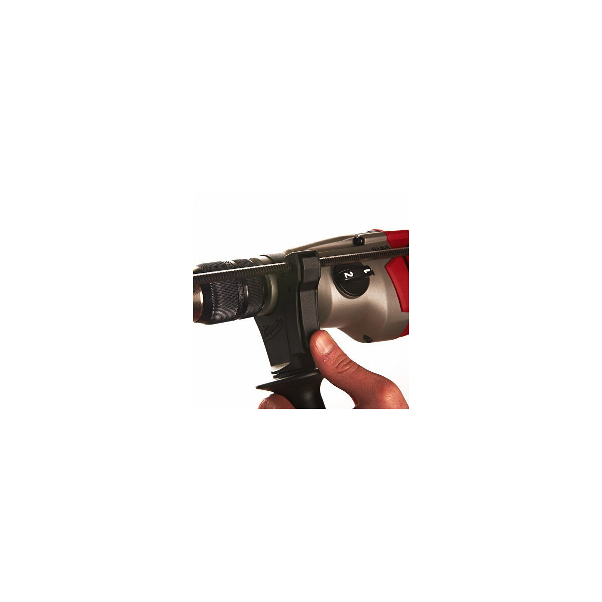 Perceuse à percussion électrique 1020 W PD2E 24 R Milwaukee Caractéristiques: - Moteur délivrant une puissance de 1020 W, un couple de 60 Nm, 2 vitesses mécaniques et un variateur de vitesse. - Nouveau système d'engrenages "tout métal" pour une longévité accrue -Débrayage de sécurité en cas de surcharges ou de blocages. - Stop de frappe pour le travail du bois et de l'acier. - Système anti-vibration plus efficace et large poignées SoftGrip pour une bonne prise en main et un meilleur contrôle. - Design ergonomique avec poignées affinées pour une prise en main plus sûre et plus confortable. - L'outil idéal pour les grands diamètres dans tous les matériaux. - Câble 4m. Données techniques: - Cadence de frappe max (cps/min): 40,000. - Capacité acier (mm): 16. - Capacité béton (mm): 22. - Capacité bois (mm): 40. - Capacité mandrin (mm): 13. - Capacité pierre (mm): 24. - Couple blocage statique (Nm): 60. - Emballage: Coffret. - Livré avec: poignée latérale avec butée de profondeur, coffret. - Poids (kg): 3.0. - Puissance absorbée (W): 1020. - Vitesse à vide en vitesse 1 (tr/min): 0 - 1000. - Vitesse à vide en vitesse 2 (tr/min): 0 - 3200.