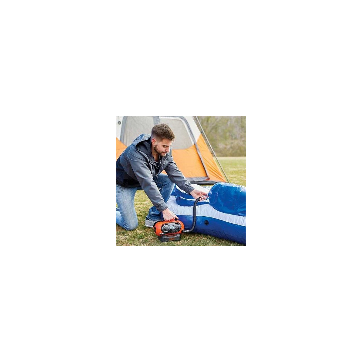 Compresseur d'air AC / DC pour 230V / 12V / 18V Black&Decker Caractéristiques: - Possibilité de fonctionnement sur batterie du système BLACK + DECKER 18V. - Connexion d'alimentation de voiture 12V. - Le premier gonfleur avec 3 types d'alimentation (AC / DC 230V, 12V, 18V). - Puissance de gonflage jusqu'à 160 PSI ou / et 11 Bars. - Écran d'étalonnage numérique avec arrêt automatique. - Comprend un espace de stockage pour les câbles d'alimentation et les accessoires. - Capacité: 160 PSI / 11.03 BAR. Données techniques: - Type de produit: Gonfleur. - Tension: 18 V. - Cylindre ES: 2 ES n °. - Capacité: 160 PSI / 11.03 BAR. - 230V: Oui. - Adaptateur 12 V: Oui. - Déconnexion automatique: Oui. Il comprend: - 3 buses pour équipement sportif. - Tuyau de gonflage de grand volume pour matelas et gonflables. - N'inclut pas la batterie ou le chargeur.