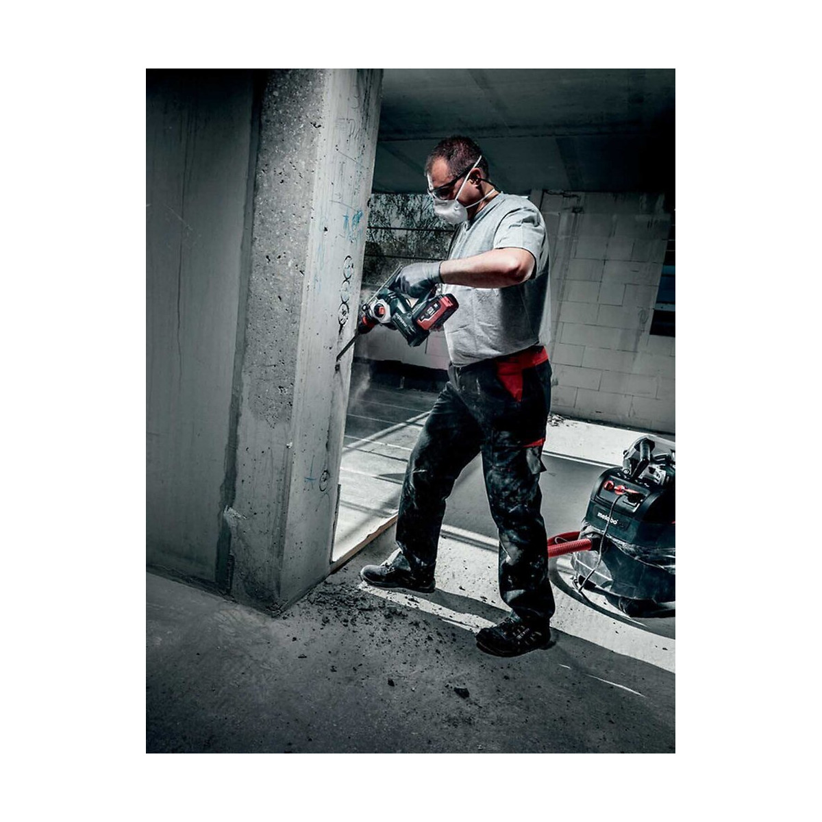 Marteau Perforateur METABO KHA 18 LTX BL 24 Quick - Marteau Perforateur extrêmement léger et maniable avec raccord d'aspiration intégré - Puissance de perçage, efficacité et longévité maximales grâce à la technologie Brushless et au mécanisme de frappe haute performance - Marteau Perforateur avec 3 fonctions : perçage à percussion, perçage et burinage - Metabo VibraTech : système d'amortissement intégré et poignée supplémentaire pour réduire les vibrations et protéger la santé - Metabo Quick : changement de mandrin rapide et sans outil pour travailler avec des forets SDS-plus et cylindriques - Système électronique Vario-Constamatic : pour percer avec des vitesses adaptées aux matériaux et qui restent quasi constantes en charge - Double sécurité grâce à l'arrêt électronique et mécanique de sécurité en cas de blocage du foret - Lampe de travail à LED pour une visibilité optimale de la zone de perçage