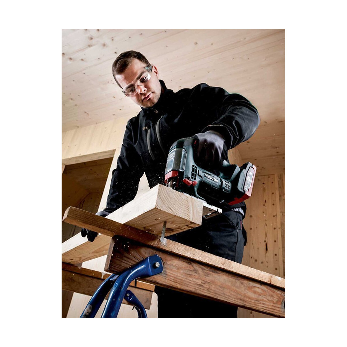 Scie Sauteuse METABO STAB 18 LTX 100 - La possibilité de régler la vitesse, le dispositif pendulaire et le guidage de la lame bas sur ressorts permettent un sciage précis et adapté au matériau - Système Metabo Quick pour changer la lame sans outil avec expulsion automatique - Poignée en arceau avec surface Softgrip anti-dérapante - Souffleur de copeaux désactivable pour une bonne visibilité de la zone de coupe