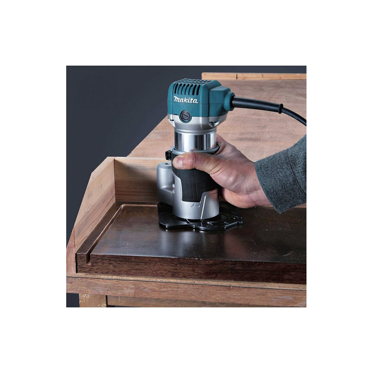 Affleureuse MAKITA RT0700C - Outil multifonction, il suffit de changer de base pour effectuer différents travaux - Nouveau type de base, avec un système de réglage de la hauteur de coupe grâce à une crémaillère et avec la possibilité de la verrouiller, sans espaces pour un réglage exact et précis - Contrôle de la vitesse par cadran, qui permet de sélectionner la vitesse optimale en fonction du travail à effectuer - Contrôle électronique de la vitesse, qui maintient des révolutions constantes sous charge - Carter supérieur plat du moteur, pour un changement d'accessoire facile - Boîtier et base en aluminium pour plus de durabilité et de précision - Changement facile des accessoires avec blocage d'arbre - Possibilité d'utiliser d'autres accessoires optionnels