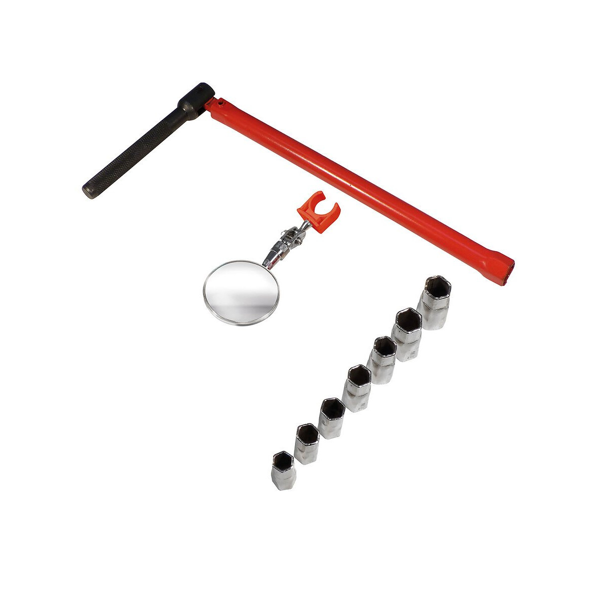 Clé à robinets 13 mm + 7 embouts avec miroir clipsable et orientable. Kit démontage de mitigeurs avec 7 embouts à ressort. Avec miroir pour une saisie facile du filetage sans visibilité directe. Diamètres : 8-9-10-11-12-14-17 mm.