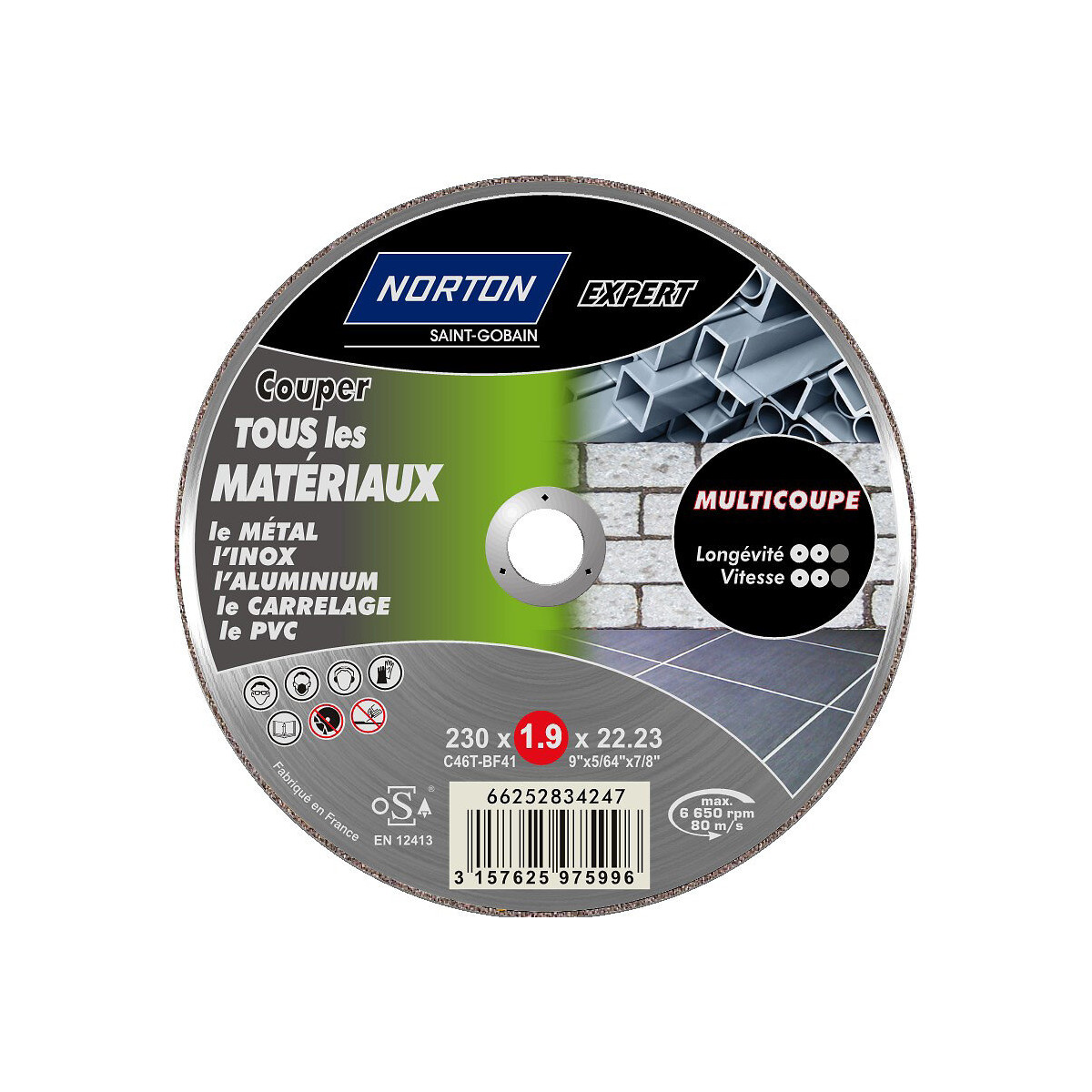 Diamètre (en mm): 230 Epaisseur de la meule (en mm): 2 Niveau de finition: Coupe Type de machine: Meuleuse Surface à travailler: Multi matériaux Type de matériau: Multimatière Produit emballé : hauteur (en cm): 22.8 Produit emballé : largeur (en cm): 22.9 Produit emballé : profondeur (en cm): 0.4 Produit emballé : poids (en kg): 0.162 Indication du geste de tri (triman): Nos produits et emballages peuvent faire l'objet d'une consigne de tri. Pour en savoir plus : www.quefairedemesdechets.fr