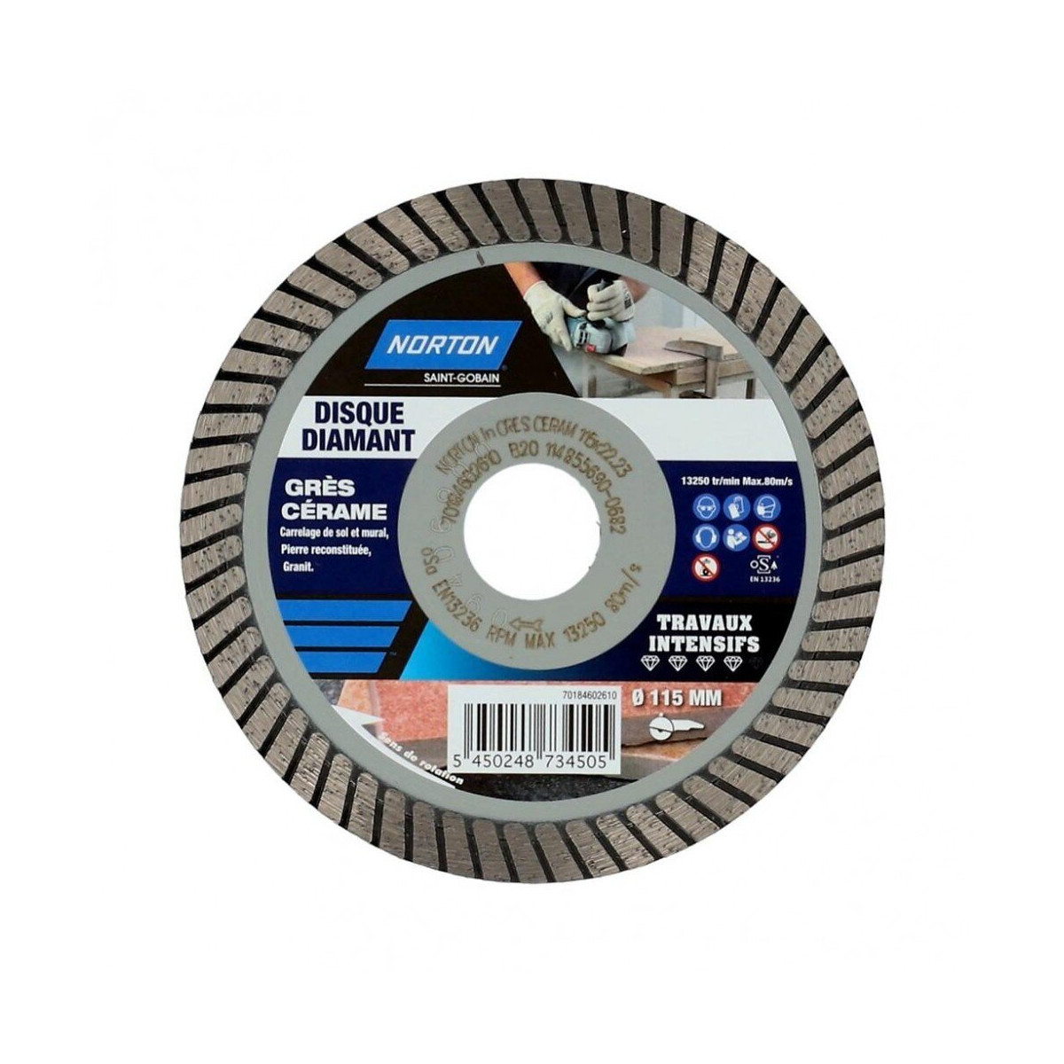 Disque diamant Norton Ø115x22,23 mm adapté aux travaux intensifs pour une utilisation sur grès cérame, du granit marbre, du carrelage de sol et mural et de la pierre reconstituée. Sa hauteur de segment de 7 mm permet une découpe des revêtements de sols intérieurs et terrasses rapide et sans éclats. Utilisation sur meuleuse uniquement. Epaisseur de la meule (en mm): 1.7 Diamètre (en mm): 115 Niveau de finition: Coupe Descriptif: Disque diamant Norton Ø115x22,23 mm adapté aux travaux intensifs pour une utilisation sur grès cérame, du granit marbre, du carrelage de sol et mural et de la pierre reconstituée. Sa hauteur de segment de 7 mm permet une découpe des revêtements de sols intérieurs et terrasses rapide et sans éclats. Utilisation sur meuleuse uniquement. Alésage (en mm): 22.23 Type de matériau: Grès Type de machine: Meuleuse Produit emballé : hauteur (en cm): 0.5 Produit emballé : largeur (en cm): 12.5 Produit emballé : profondeur (en cm): 14 Produit emballé : poids (en kg): 0.13 Indication du geste de tri (triman): Non