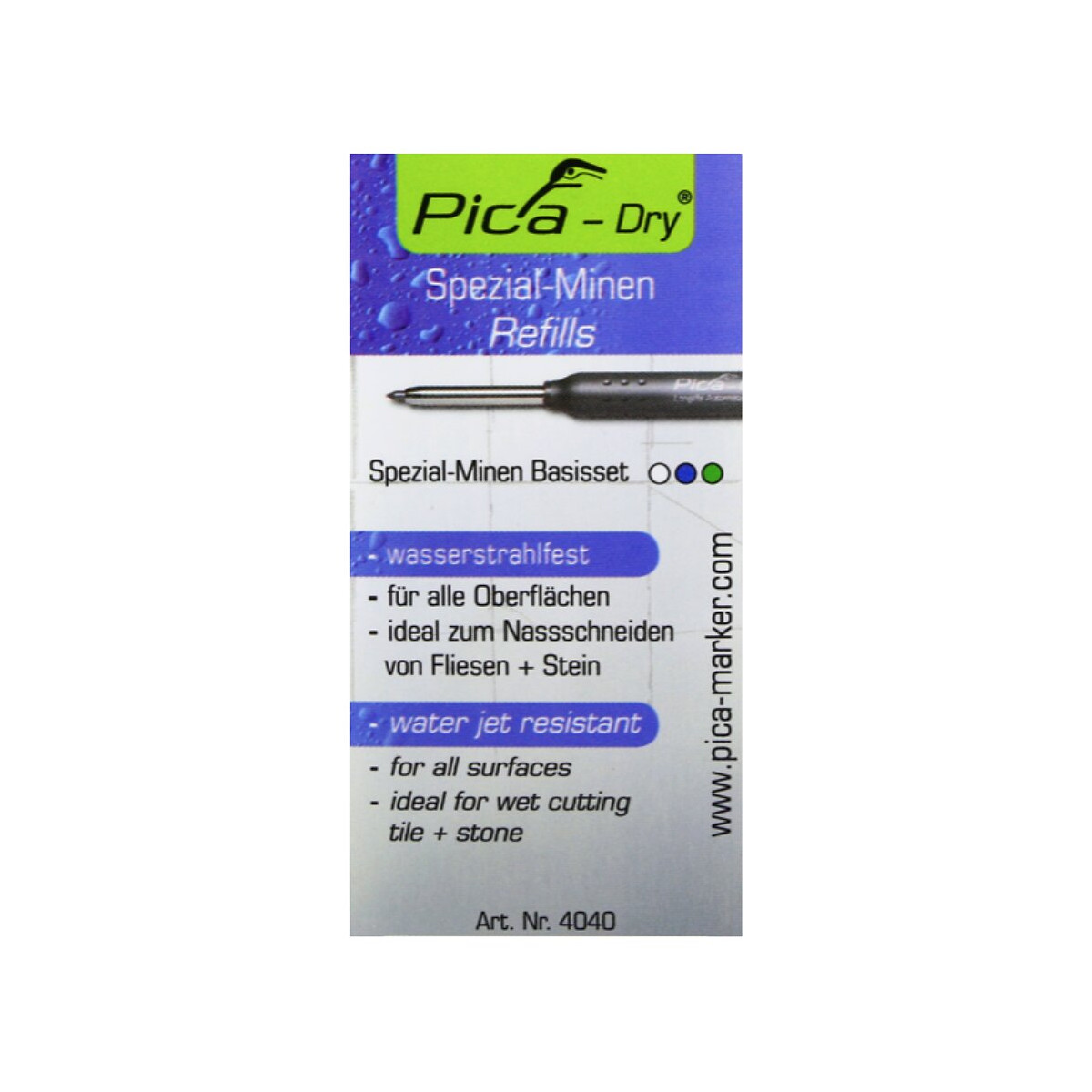 Contenu de la livraison: - 2x Pica DRY Mines de rechange blanc - 3x Pica DRY Mines de rechange bleu - 3x Pica DRY Mines de rechange verte - 1x Boîte en plastique pratique Description du produit: Ces mines spéciales de rechanges de Pica Dry conviennent pour presque toutes les surfaces, qu'elles soient lisses ou rugueuses, sèches ou humides, poussiéreuses ou huileuses. Elles sont particulièrement adaptées à la coupe humide des carreaux et des pierres. Ces mines spéciales Pica Dry sont sans chlorure. Spécifications techniques: Longueur : 125 mm Diamètre : 2,8 mm Poids : 30 g