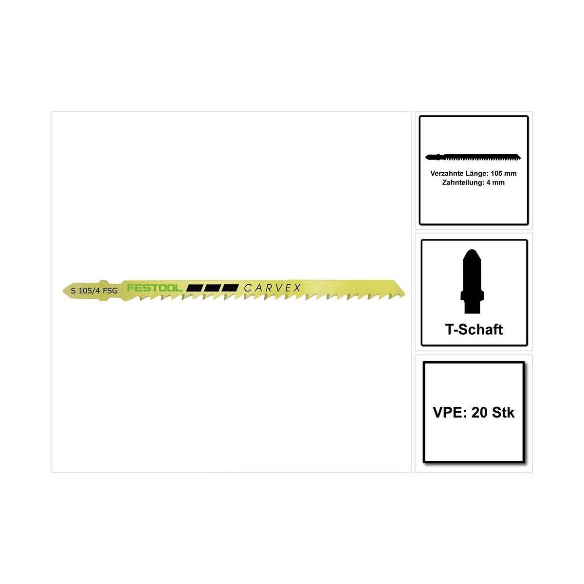 Contenu du paquet: - 20x Festool S 105/4 FSG WOOD Universal Lame de scie sauteuse ( 204332 ) Description du produit: La lame de scie sauteuse universelle WOOD pour coupes à angle droit couvre tous les matériaux à base de bois et convient même aux coupes courbes. L'acier HCS de haute qualité (acier à haute teneur en carbone) le rend particulièrement stable. En conjonction avec un rail de guidage, les coupes droites réussissent parfaitement. Les dents limitées ainsi que la coupe conique garantissent une coupe correcte. La longueur dentelée de 105 mm au pas de 4 mm permet l'usinage de pièces d'une épaisseur maximale de 60 mm. Spécifications techniques: Longueur dentée: 105 mm Pas de dents: 4 mm Epaisseur maximale de la pièce: 60 mm Porte-outils: T-shaft Nombre: 20 pièces
