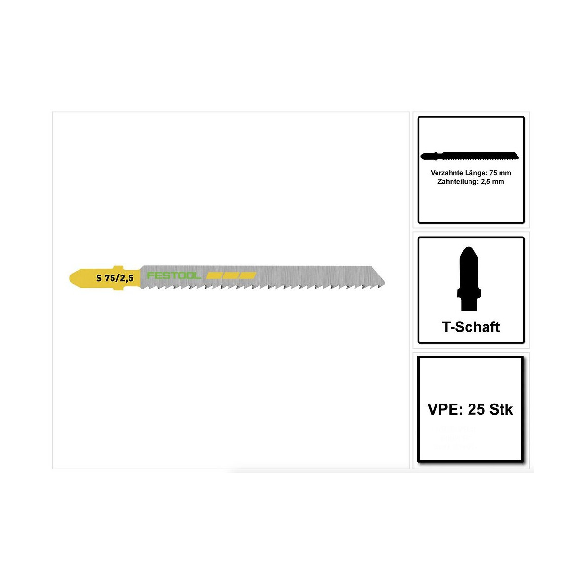 Contenu du paquet: - 25x Festool S 75/2,5 WOOD Fine Cut Lame de scie sauteuse ( 204257 ) Description du produit: La lame de scie sauteuse WOOD Fine Cut impressionne par son affûtage conique et par son résultat de coupe extrêmement propre. La surface précisément coupée et sans déchirure nécessite moins de post-traitement de la pièce à travailler en bois qu'avec les lames de scie traditionnelles. L'acier HCS (acier à haute teneur en carbone) est extrêmement robuste. Avec une longueur dentée de 75 mm et un pas de 2,5 mm, une épaisseur maximale de pièce de 30 mm peut être usinée. La norme de qualité Festool garantit une longue durée de vie. Spécifications techniques: Longueur dentée: 75 mm Pas de dents: 2.5 mm Épaisseur maximale de la pièce: 30.00 mm Porte-outils: T-shaft Nombre: 25 pièces