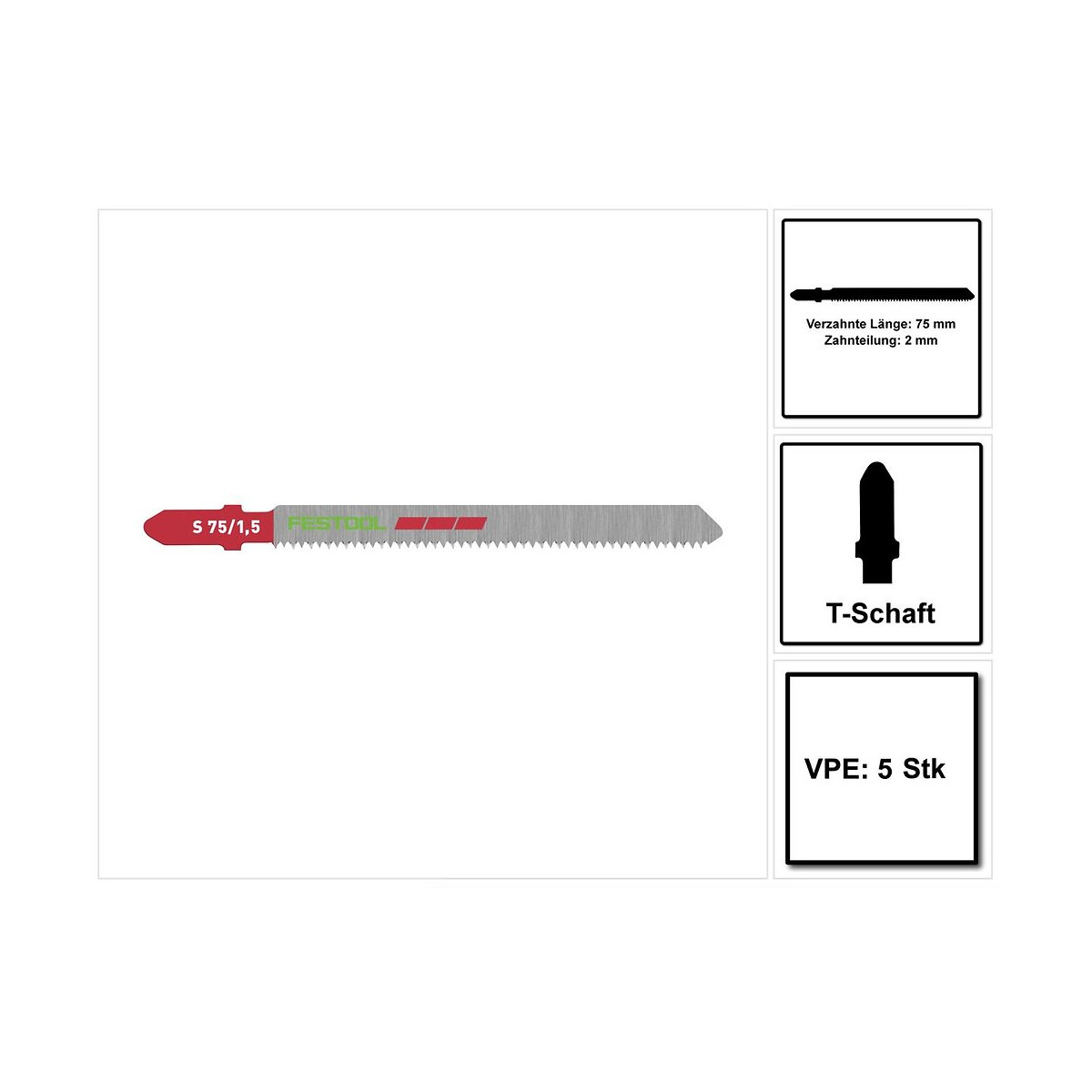 Contenu du paquet: - 5x Festool S 75/1,5 Lame de scie sauteuse ( 204268 ) Description du produit: La lame de scie sauteuse pour profilés en plastique, dotée d'une denture neutre (dents de scie orientées verticalement de 90 degrés vers le bas) et d'un pas de 1,5 mm, est idéale pour les profilés en plastique, le verre acrylique (plexiglas, par exemple) et les plastiques souples. L'acier traité HCS (acier à haute teneur en carbone) est extrêmement robuste. Avec une longueur dentée de 75 mm, une épaisseur de pièce maximale de 30 mm peut être usinée. La norme de qualité Festool garantit une longue durée de vie. Spécifications techniques: Longueur dentée: 75 mm Pas de dents: 1,5 mm Epaisseur maximale de la pièce: 30 mm Porte-outils: T-shaft Nombre: 5 pièces
