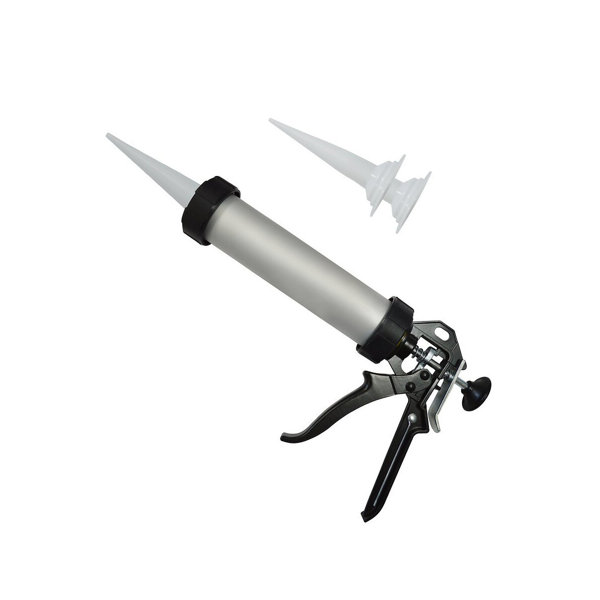 Pistolet d'étanchéité aluminium 1er Prix GO/ON - Corps en aluminium. Poignée ergonomique. Livré avec 3 buses de rechange