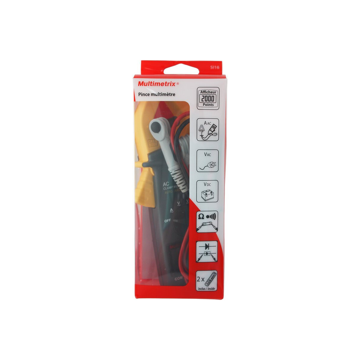 Pince Multimètre. Pour la mesure des tensions AC et DC, des intensités AC, des résistances, des continuités sonores, test des diodes. Détail : Grand afficheur 2000 points. Mesure des tensions alternatives et continues jusqu'à 600Volts. Mesure d'intensités alternatives jusqu'à 600A. Mesure de résistance. Fonctions MAX. Fonction "HOLD" mémorisation de la mesure. 600V CAT II / 300V CAT III. Cordon rouge et noir à pointe de touche. Piles 2x1.5V AAA fournies. Exemple d'application : Electricité et maintenance.