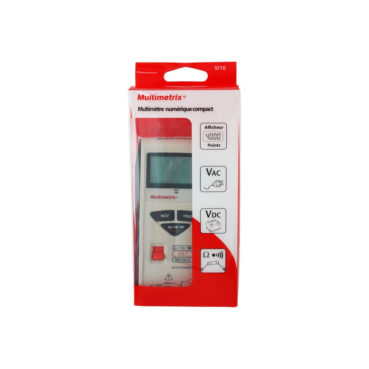 Multimètre Numérique Compact. Pour la mesure des tensions AC et DC, des résistances, des continuités sonores. Détail : Afficheur 4000 points. Calibres automatiques (autorange). Mesures des tensions alternatives et continues jusqu'à 600Volts. Extinction automatique. Fonction "HOLD" mémorisation de la mesure. Logement pour cordon et pointes de touche. 600V CAT II. 2 piles LR 44 fournies. Exemple d'application : Vérification de la présence secteur. Contrôle piles et batterie automobile, jouet, Vérification des connexions et raccordements électriques. Contrôle de l'état des fusibles. Bricolage.
