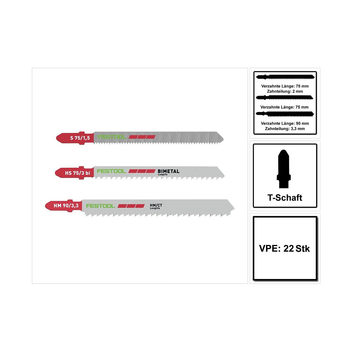 Contenu du paquet: - 10x Lames se scie sauteuse HS 75/3 BI ( 204336 ) - 10x Lames de scie sauteuse S 75/1,5 ( 204268 ) - 2x Lames de scie sauteuse HM 90/3,3 ( 204269 ) Description du produit: Avec le jeu de lames de scie sauteuse STS-Sort PLASTICS de Festool, l’usinage de matières plastiques solides, de plastiques renforcés de fibres, de profilés en plastique, de verre acrylique (p.ex. en plexiglas), de plastiques souples, de stratifiés (stratifiés haute pression), de gypse et de feuilles liées à la résine de mélamine (p.ex. Trespa) ne pose plus de problème. Les lames de scie sauteuse extrêmement robustes sont conçues exactement pour les applications individuelles et parfaitement conçues. Grâce aux différents types d'acier utilisés, la longévité et l'usure sont garanties. Grâce au métal BI (composé HCS et HSS), la lame de scie sauteuse Plastics Solid Materials résiste aux températures élevées, a une longueur dentée de 75 mm et un pas de 3 mm. La lame de scie sauteuse Plastics Profile a une denture neutre (les dents de scie pointant verticalement vers le bas à un angle de 90 degrés). Il est fabriqué en acier HCS (acier à haute teneur en carbone), a une longueur dentée de 75 mm et un pas de 1,5 mm. La lame de scie sauteuse Plastics en stratifié impressionne par sa durée de vie extrêmement longue, sa longueur dentée de 90 mm et son espacement de 3,30 mm. Toutes les lames de scie peuvent traiter une épaisseur maximale de pièce de 30 mm. Spécifications techniques: Lame de scie sauteuse Plastics Solid Materials HS 75/3 BI (204336): Matériau: Bi-métal (composé HCS et HSS) Longueur dentée: 75 mm Pas de denture: 3 mm Épaisseur maximale de la pièce: 30 mm Enregistrement: en T Quantité: 10 pièces Lame de scie sauteuse S 75 / 1.5 (204268): Matériau: acier HCS (acier à haute teneur en carbone / acier à haute teneur en carbone) Longueur dentée: 75 mm Pas de denture: 1,5 mm épaisseur maximale de la pièce: 30 mm Enregistrement: en T Quantité: 10 pièces Lame de scie sauteuse HM 90 / 3.3 (204269): Matériel: carbure Longueur dentée: 90 mm Pas de denture: 3,30 mm épaisseur maximale de la pièce: 30 mm Enregistrement: en T Quantité: 2 pièces