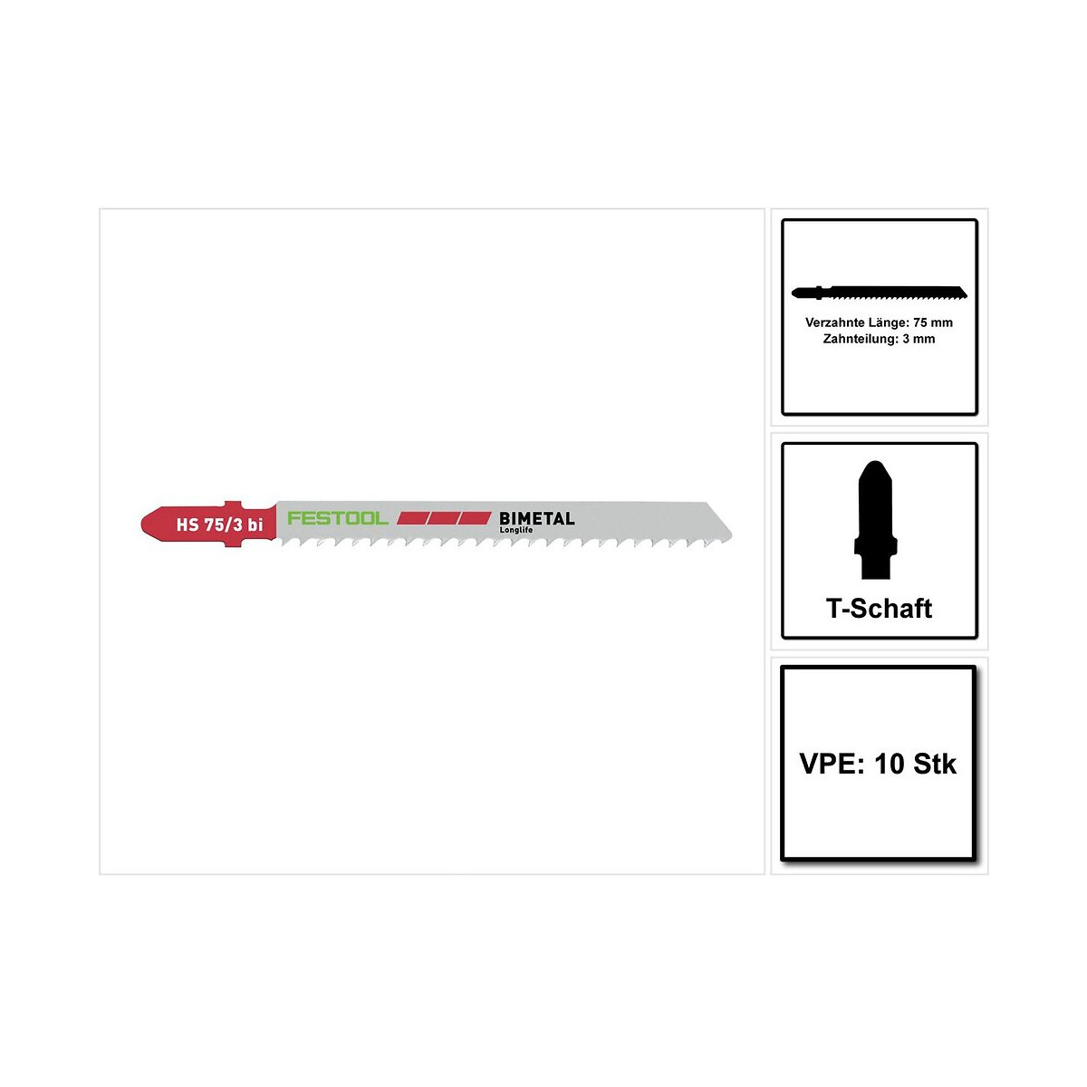 Contenu du paquet: - 10x Festool HS 75/3 BI / 10 Lames de scie sauteuse (204336) pour matière plastique solide, plastiques renforcés de fibres Description du produit: Grâce au métal BI (composé HCS et HSS), la lame de scie sauteuse Plastics Solid Materials résiste aux températures élevées et à l'usure. Les cas difficiles tels que les matériaux solides en plastique et les plastiques renforcés de fibres l'ont vu sans problème avec d'excellents résultats. Avec une longueur dentée de 75 mm et un pas de 3 mm, il est possible d'usiner une épaisseur maximale de pièce de 30 mm. La norme de qualité Festool garantit une longue durée de vie. Spécifications techniques: Longueur dentée: 75 mm Pas de dents: 3 mm Epaisseur maximale de la pièce: 30 mm Enregistrement: T-shaft Nombre: 10 pièces