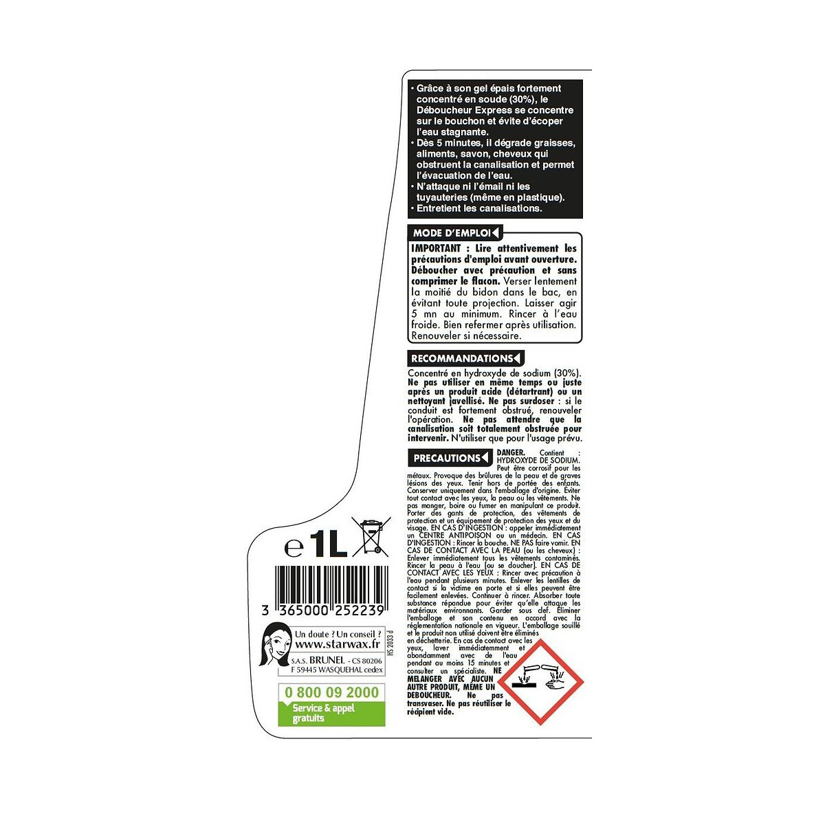 Spécial eau stagnante, évier, lavabo, douche et baignoire. Evite d'écoper. A la soude concentrée et à l'amoniac Grâce à sa formule en gel express, le produit se concentre sur le bouchon et agit en 5 minutes sur les matières organiques, graisses, cheveux, même en eau stagnante quand la canalisation est complètement bouchée. N'attaque ni émail, ni les tuyauteries (même plastiques). Entretien les canalisations. Nom du produit: Déboucheur Type de produit: Gel Indication du geste de tri (triman): Nos produits et emballages peuvent faire l'objet d'une consigne de tri. Pour en savoir plus : www.quefairedemesdechets.fr
