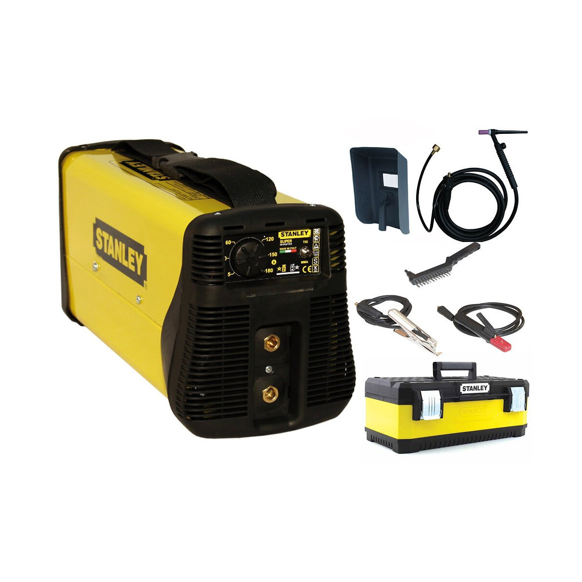 Ce poste à souder compact et léger vous est livré avec une boîte à outils Stanley bi-matière (métal + polypropylène) mais aussi avec 1 pince porte électrode, 1 pince masse, 1masque de soudure, 1 brosse-marteau et 1 torche tig. Caractéristiques : - Poste à souder Inverter de 5 à 160A et fonction TIG intégrée. - Electrodes maxi 4mm pour soudage acier, fonte, inox. - Puissance absorbée 3,2 KVA à 60%. - Compatible générateur 8,9 KVA. - Idéal pour : soudure acier/inox/fonte, électrodes enrobage basique/rutile/inox, ferronnerie, serrurerie, tôlerie, charpentes métalliques, soudure précise et en continu avec la fonction Tig Lift.Spécifications techniques