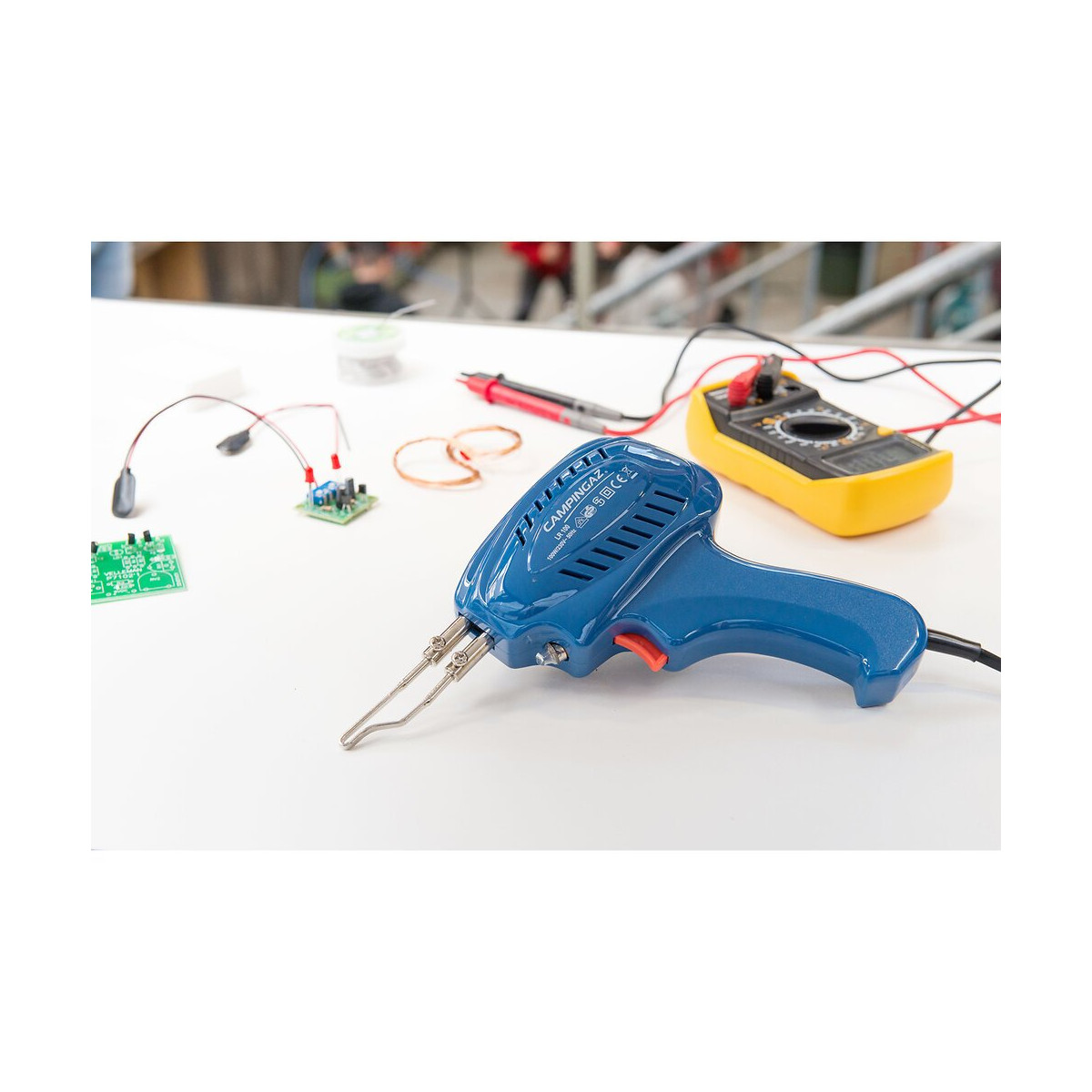Pistolet à souder 100W instantané : le fer est utilisable quelques secondes après son allumage. Le fer électrique CAMPINGAZ L 100W est idéal pour les petites soudures en électricité, électronique et modélisme. Puissance : 100Watts. Température de chauffe : 570°C. Utilisable quelques secondes après son allumage. Dimensions de la panne : longueur : 70 mm , diamètre : 4 mm. Ampoule 2,2V intégrée pour l'éclairage de la zone de travail. Ergonomique pour une excellente prise en main. Livré avec 2 pannes de rechange.Spécifications techniques