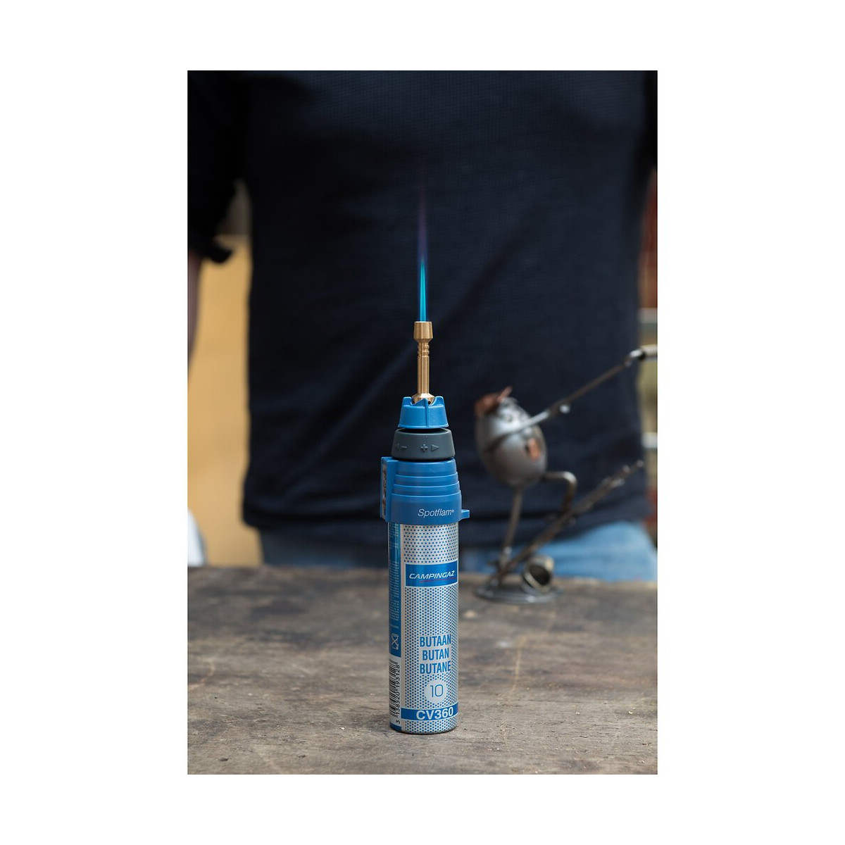 Stylo-flamme/ Fer à souder sans fil. Cette lampe à souder, sans fil est idéale pour les travaux de précision sur de petites surfaces (bijouterie, modélisme…). Température de flamme : 1 650°C. L’appareil se connecte et se déconnecte de la cartouche à valve, même quand elle est pleine. Peut-être utilisée dans n’importe quelle position sans préchauffage grâce à sa cartouche exclusive antiphase liquide (dispositif intégré d’absorption du butane liquéfié). Brûleur laiton à flamme dard haute précision . Température de chauffe ajustable avec une seule main. Autonomie : 4 heures. Livrée avec une pointe fer à souder. Fournie avec une cartouche CV360 (butane). Cet appareil doit être utilisé exclusivement avec des cartouches CV360 CAMPINGAZ®. Poids : 61 g.Spécifications techniques