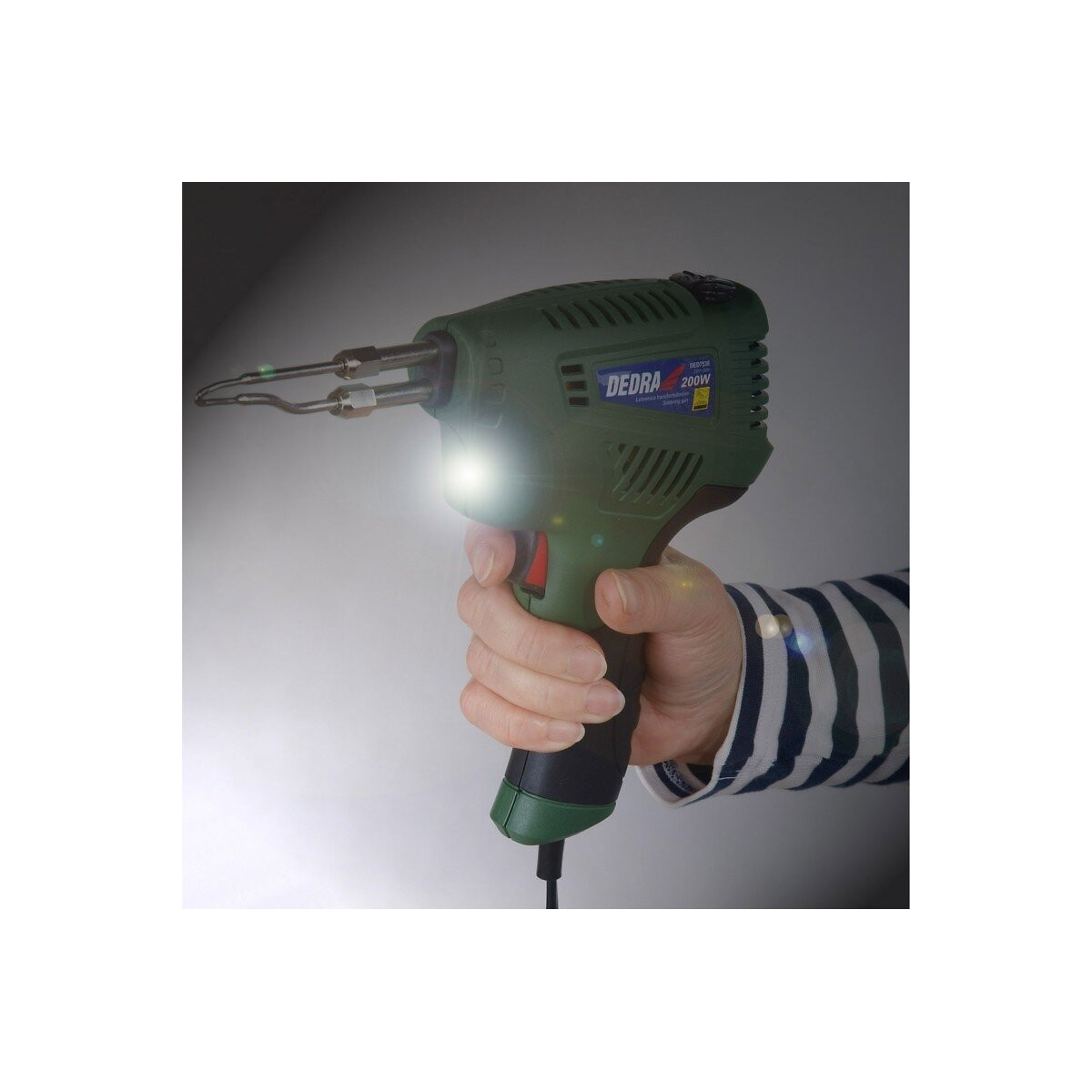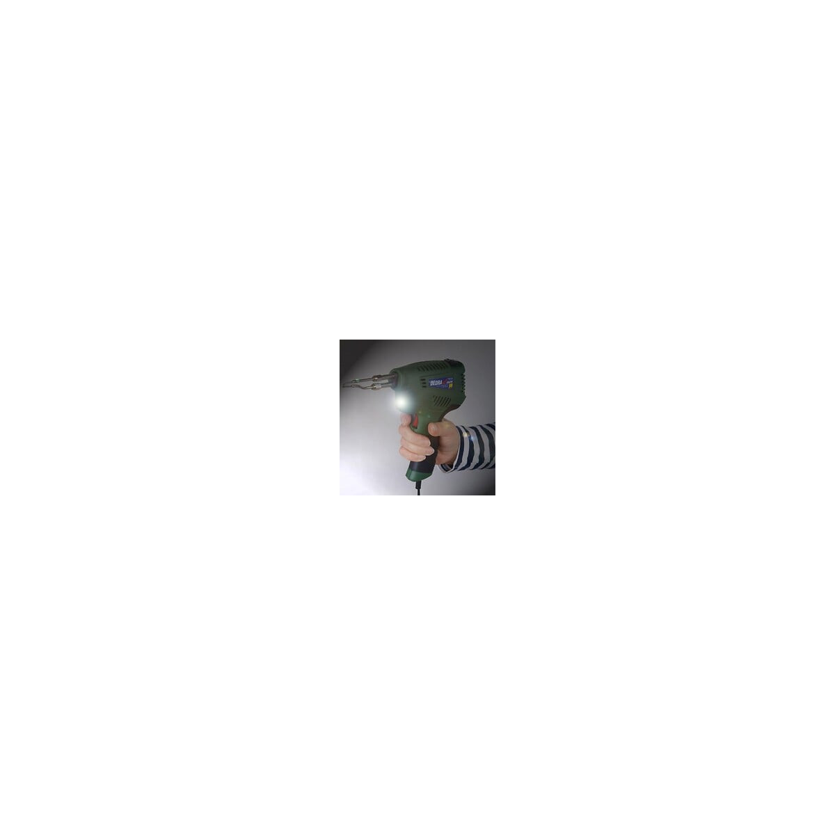 Pistolet à souder avec transformateur et température réglable. Il permet une soudure tendre à l'aide d'un liant (par exemple l'étain). Le transformateur permet d'obtenir une température élevée en quelques secondes. Idéal pour les petits travaux de la maison ou d'atelier., CARACTÉRISTIQUES TECHNIQUES: Alimentation : 220-240 V, 50 Hz, Puissance : 200 W, Température de chauffe maximale : 600 °C, Plages de températures (1ère position) : 70 - 200 °C, Plages de températures (2ème position) : 200 - 350 °C, Plages de températures (3ème position) : 350 - 600°C