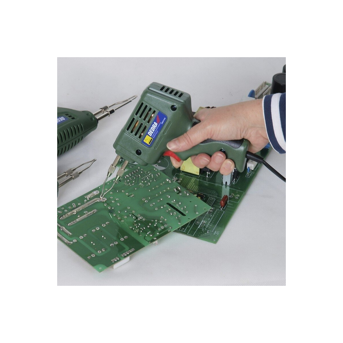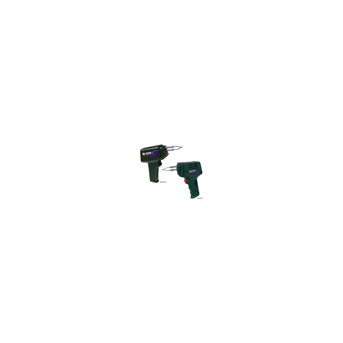 Le fer à souder transformateur est un outil pratique qui s'avérera utile pour le brasage tendre des éléments au moyen de la colle de soudure. Il est conçu pour un usage domestique, CARACTÉRISTIQUES TECHNIQUES: Tension d'alimentation : 230 V/50 Hz, Puissance maximale : 175W, Température max. de chauffage : ~600°C, Temps de chauffage : 12s, Temps de pause : 48s, Le temps de chauffage rapide de 12 secondes permet un travail efficace, La lampe éclaire le point de soudure, ce qui augmente la précision, Une poignée profilée permet une prise confortable du fer à souder