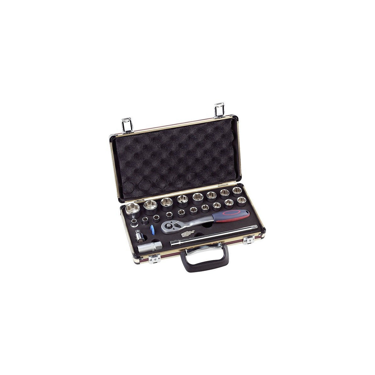 Coffret de clés à douilles, 23 pièces, carré 1/2", cliquet réversible à griffe bimatière. Acier chrome Vanadium Cet article comprend: 9 douilles: 10, 11, 12, 13, 14, 15, 16, 17, 18 mm 9 douilles réduites: 19, 20, 21, 22, 23, 24, 27, 30, 32 mm 1 rallonge: 250 mm 1 poignée coulissante 1 clé à bougie: 21 mm 1 cliquet réversible: 1/2" MAXI TORQ Plus 1 molette de vissage rapide