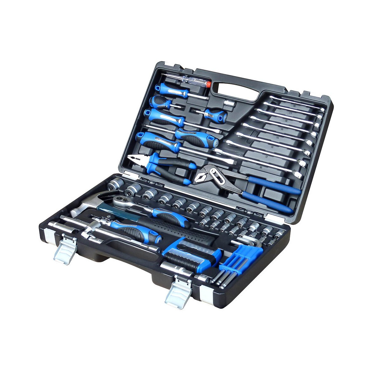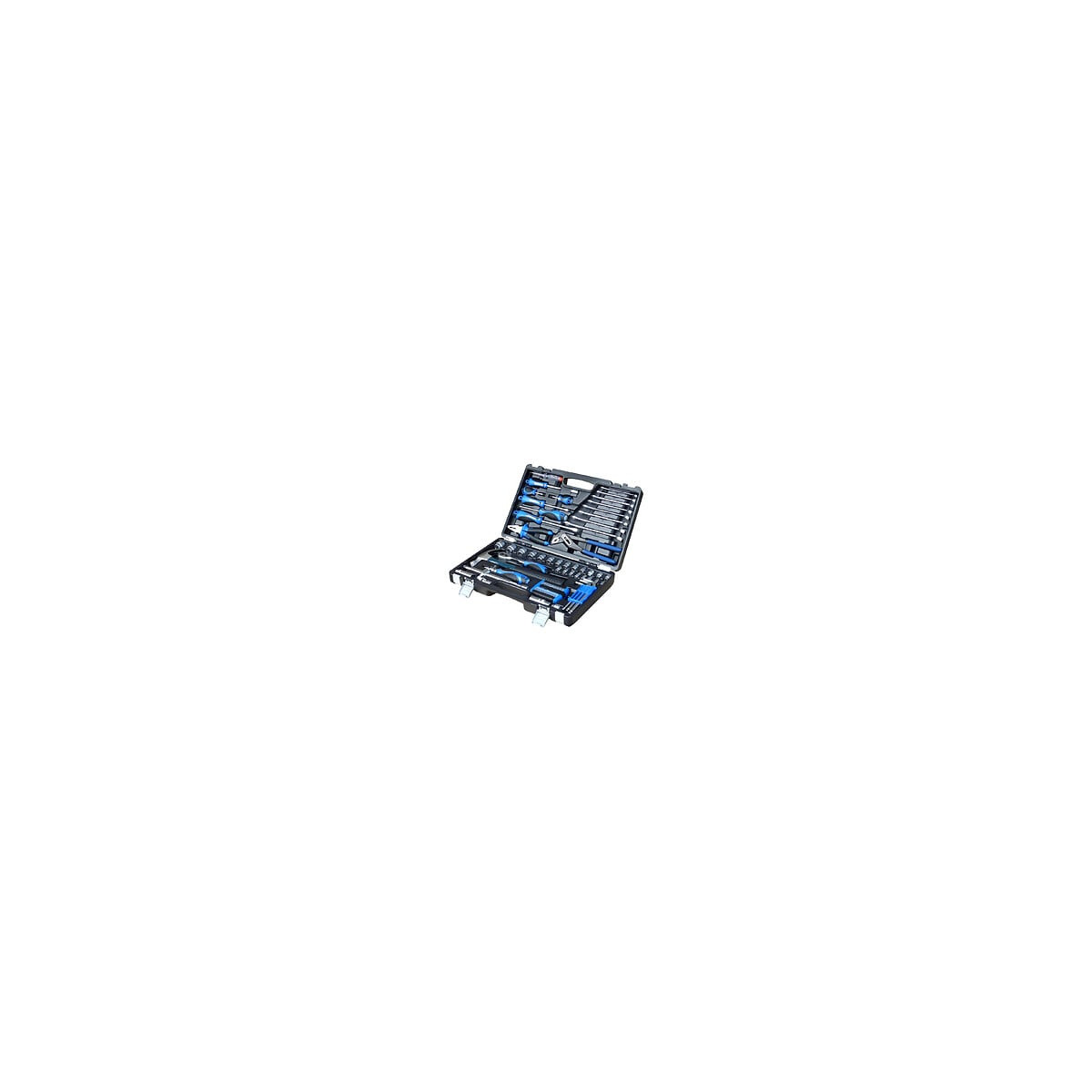 Outils en acier au chrome vanadium finition satinée. Composition du coffret : 1 cliquet poignée bi-matière 3/8 - 10 douilles 6 pans 3/8 de 10 à 24 mm - 2 douilles 3/8 à bougies : 16 et 21 mm - 1 rallonge 3/8 250 mm - 1 cardan 3/8 - 1 réducteur 1/2 à 3/8 - 1 réducteur 3/8 à 1/4 - 1 cliquet poignée bi-matière 1/11 douilles 6 pans 1/4 de 4 à 13 mm - 8 clés mixtes de 10 à 19 mm - 9 clés longues 6 pans tête sphé- rique de 1,5 à 10 mm - 1 marteau arrache-clou manche bi-matière - 1 pince multiprise manches bi-matière - 1 pince universelle manches bi-matière - 5 tournevis mécanicien manche bi-matière (plats et philips) - 1 tournevis testeur 220 V - 1 tournevis porte-embouts à cliquet manche bi-matière - 31 embouts de vissage 25 mm (plats, philips, pozidriv, hex, torx) - 3 adaptateurs.