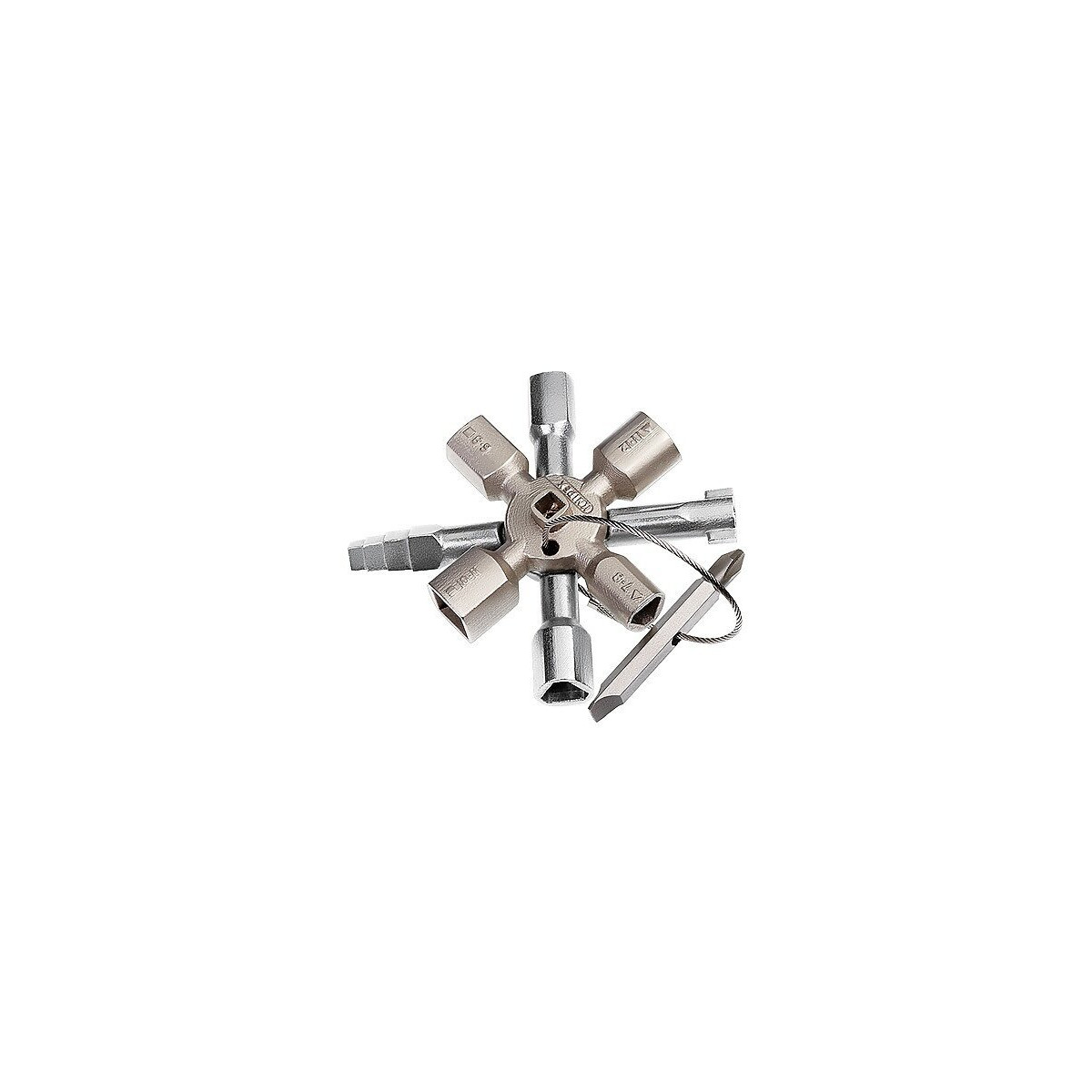 Clé multifonctionnelle pour l’actionnement des fermetures depuis les zones technique des bâtiments (chauffage et sanitaire, technique de climatisation et de ventilation, électrotechnique), Alimentation en gaz et en eau et systèmes d’arrêt. Version à 8 jets: 2 clés cruciformes reliés par des aimants pour économiser de l'espace. Embout réversible: fente 1,0 x 7 mm et fente cruciforme PH 2. Clé et embout réversible accouplés par un fil métallique robuste en acier inoxydable. Enduction surfacique de haute qualité.