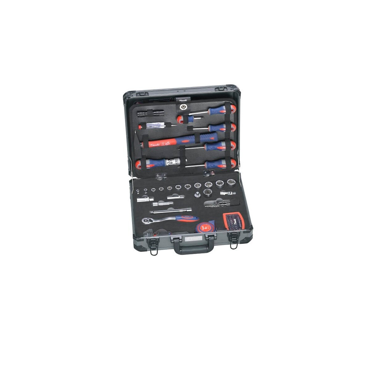 Le coffre à outils 99 pièces de KWB propose une large sélection d‘outis à main, idéal comme outillage essentiel pour l‘atelier. En coffre aluminium pour un transport facile. 1 pince coupante de côté 160 mm, CV 1 pince universelle 180 mm, CV 1 pince de pompe à eau 240 mm, CV 1 jeu de clés mixtes 8-19 mm, 8 pièces, CV 1 tournevis Pozidriv 1 x 75 mm 1 tournevis Pozidriv 2 x 100 mm 1 tournevis pour carburateur cruciforme 2 x 2,5 mm, CV 1 tournevis plat 5 x 75 mm 1 tournevis plat 6 x 100 mm 1 tournevis testeur, 200-250V, GS 1 LED lampe de poche avec la batterie 1 cutter à lames trapèze 1 jeu de 9 clés 6-pans, 1,5-10 mm, CV 12 douilles 3/8“, 6-24 mm, CV 1 douille à bougies 3/8“, 16 mm, CV 1 douille à bougies 3/8“, 21 mm, CV 1 clé à cliquet 3/8“, CV 1 rallonge 3/8“, 150 mm, CV 1 rallonge 3/8“, 75 mm, CV 1 cardan 3/8“, 45 mm, CV 1 adaptateur 3 voies, CV 1 marteau de mécanicien 300g, GS 1 mesure à ruban 5 m x 16 mm 1 scie à métaux 150 mm 3 lames de scies 150 mm 1 jeu d‘embouts de vissage 32 pièces: Embouts plats: 3, 4, 4.5, 5, 5.5, 6, 7 mm Embouts cruciforme: PH0, PH1, PH2, PH3, PH4 Embouts Pozidriv: PZ0, PZ1, PZ2, PZ3, PZ4 Embouts 6 pans: 1.5, 2, 2.5, 3, 4, 5, 6 mm Embouts Torx: T10, T15, T20, T25, T27, T30 1 niveau de l‘esprit d‘aluminium 300 mm 1 tournevis avec cliquet réversible 1/4“ 2 crayons carpenter 1 râpe 200 mm 1 ciseaux universels 195 mm 1 ensemble de forets: HSS, 2,3,4 mm HM (HW) TcT, 5,6,8 mm CV, 3,4,5 mm