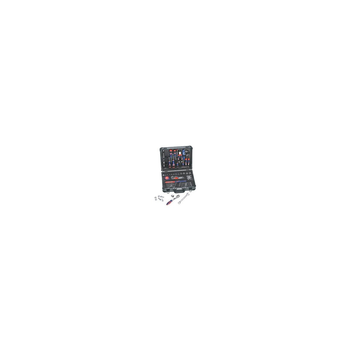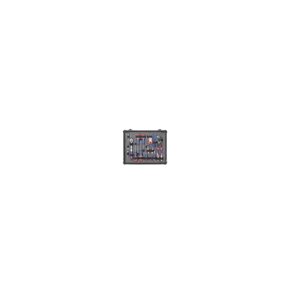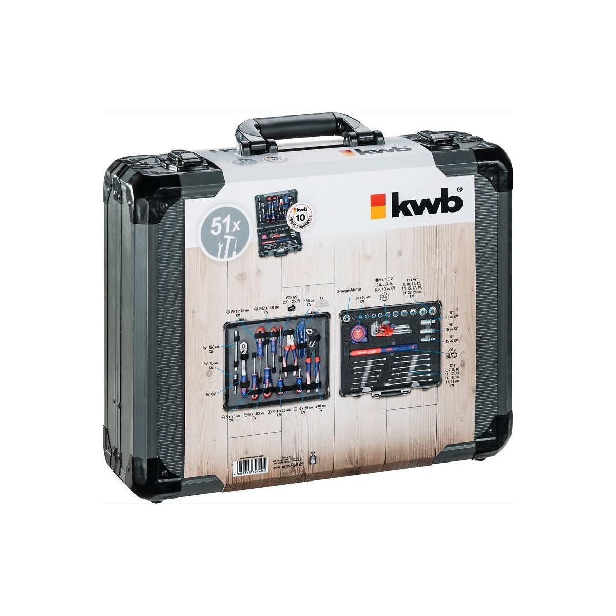 Le coffre à outils 51 pièces de KWB propose une large sélection d‘outis à main, idéal comme outillage essentiel pour l‘atelier. En coffre aluminium pour un transport facile. 1 pince universelle 180 mm, CV 1 pince de pompe à eau 240 mm, CV 1 jeu de clés mixtes 6-19 mm, 12 pièces, CV 1 tournevis Pozidriv 1 x 75 mm 1 tournevis Pozidriv 2 x 100 mm 1 tournevis plat 5 x 75 mm 1 tournevis palt 6 x 100 mm 1 tournevis pour carburateur cruciforme 1 x 2,5 mm, CV 1 tournevis pour carburateur plat 4 x 2,5 mm, CV 1 tournevis testeur, 200-250V, GS 1 cutter à lames trapèze 1 jeu de 9 clés 6-pans, 1,5-10 mm, CV 11 douilles 3/8“, 8-24 mm, CV 1 douille à bougies 3/8“, 16 mm, CV 1 douille à bougies 3/8“, 21 mm, CV 1 clé à cliquet 3/8“, CV 1 rallonge 3/8“, 150 mm, CV 1 rallonge 3/8“, 75 mm, CV 1 cardan 1/2“, 45 mm, CV 1 adaptateur 3 voies, CV 1 marteau de mécanicien 300g, GS 1 mesure à ruban 5 m x 16 mm