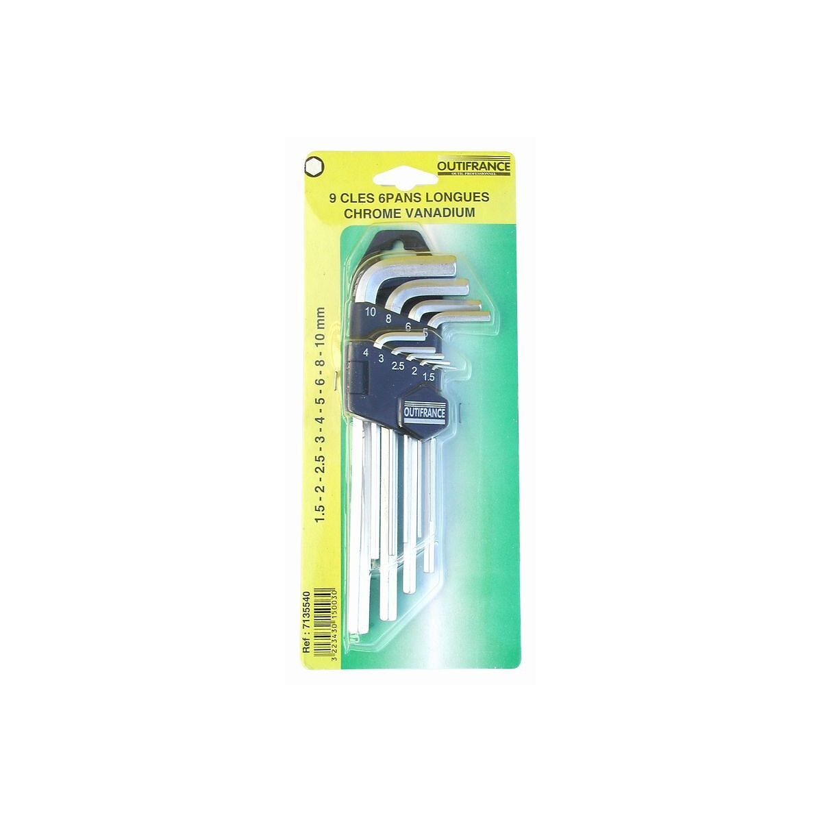 Jeu de clés 6 pans sur support. Série longue. 9 clés en chrome vanadium. Support de rangement plastique. Qualité Pro. 1,5/2/2,5/3/4/5/6/8/10 mm.