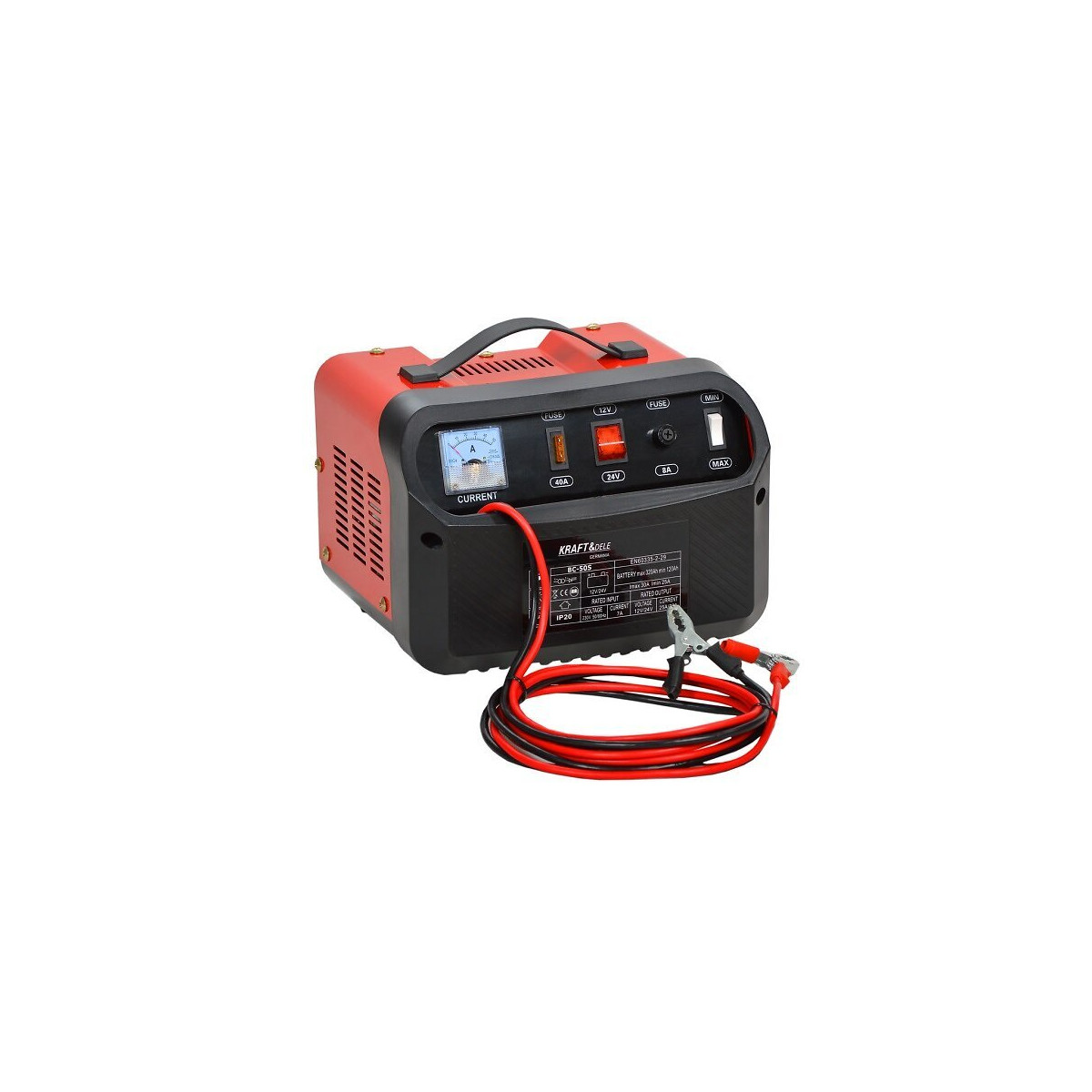 Le chargeur de batterie voiture se caractérise par une fonction de charge très performante. Il permet de recharger les batteries au plomb disposant d'une capacité de 60 à 200 Ah très rapidement et de manière économe en énergie. Le chargeur est équipé d'un ampèremètre et fuisibles qui protègent contre les détériorations de l'appareil. Grâce à sa poignée et ses dimensions compactes il est facile à transporter. Il est livré avec: pinces, câbles, fusibles x4 ; CARACTERISTIQUES TECHNIQUES: Alimentation : 230 V ; Fréquence: 50-60 Hz ; Tension chargement: 12/24 V ; Capacité batterie recommandée: 60 Ah - 200 Ah ; Ampérage chargement: 20A ; Fusible: 20A ; Ampèremètre ; Poids: 5 kg