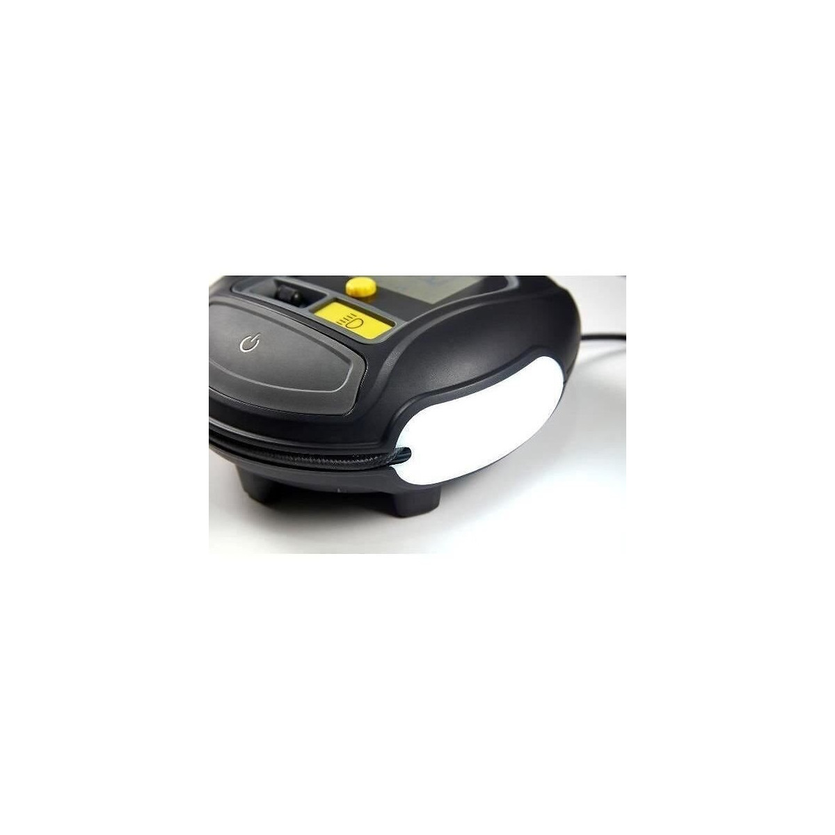 Compresseur d'air digital automatique - 12 V - Gonfle un pneu en 2 min - Jauge numérique - Ecran numérique L76 x H 48 mm - Tuyau d'air flexible - Valve de dégonflage - Câble d'alimentation - Prise de courant protégée par fusible de 12 v c.c - Conception effilée - Gros bouton marche/arret - Complet avec kit de 3 adaptateurs.