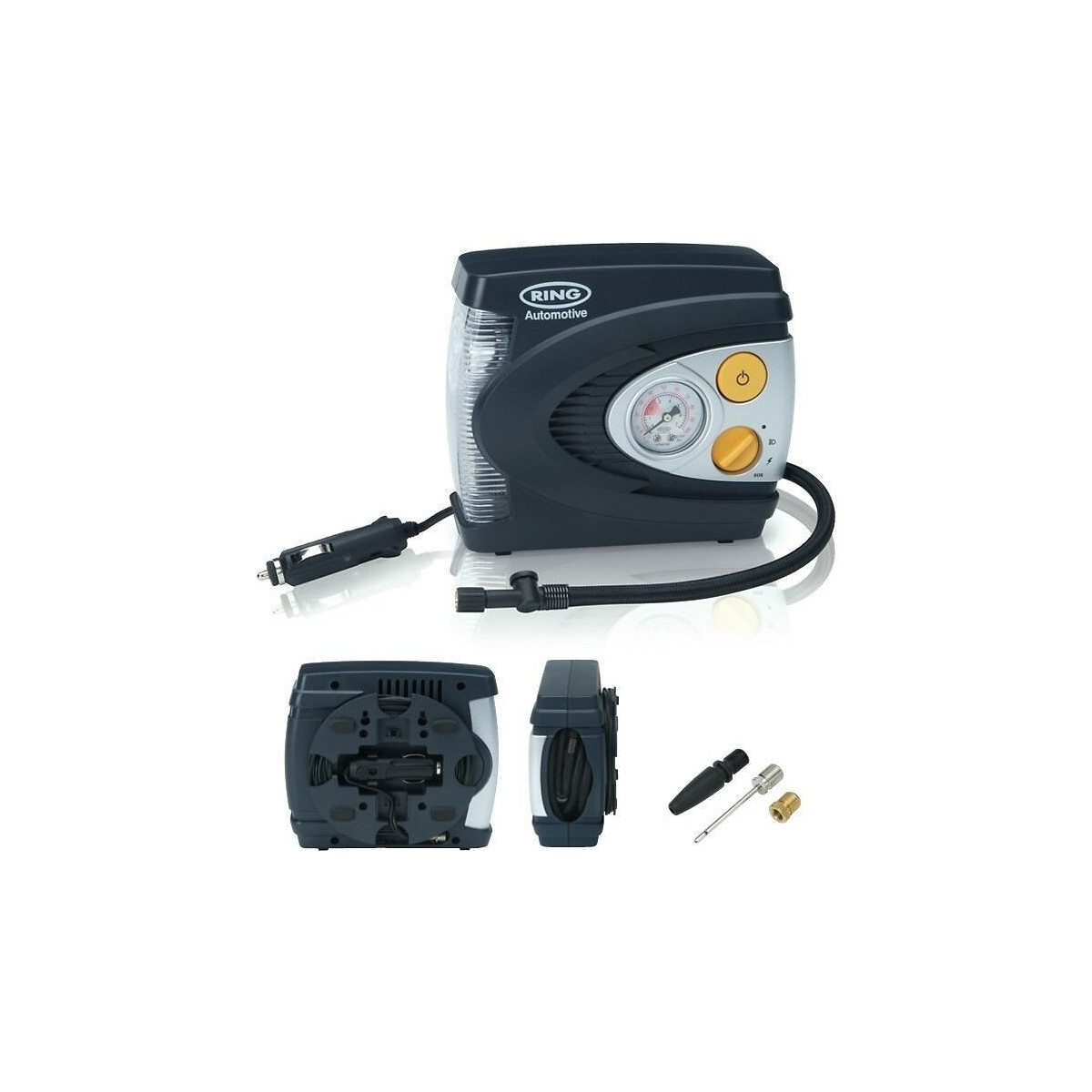 Compresseur d'air analogique 12 Volts (Via prise allume cigare). Gonflage d'un pneu en 4 minutes. Eclairage Led intense Eclairage rouge Sos. Valve de dégonflage pneus. Livré avec sacoche de transport et de rangement. Pression de gonflage maxi 6,9 BAR.