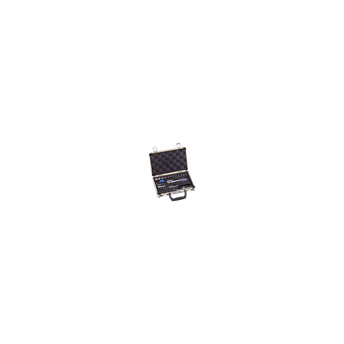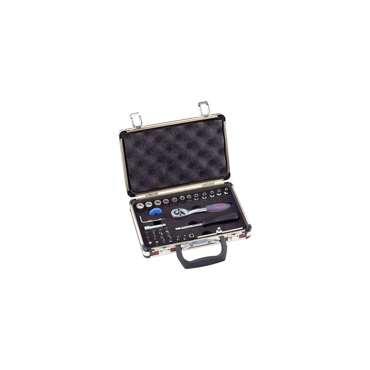 Coffret de clés à douilles, 36 pièces, carré 1/4, cliquet réversible à griffe bimatière. Acier chrome Vanadium Cet article comprend: 12 douilles: de 4, 4.5, 5, 5.5, 6, 7, 8, 9, 10, 11, 12, 13 mm 1 rallonge: 50 mm 1 tournevis-rallonge: 150 mm 1/4" carré 1 poignée coulissante 1 adaptateur: 1/4" carré à 1/4" 6 pans 3 embouts fente: 4, 5.5, 7 mm 2 embouts Phillips: 1,2 2 embouts Pozidrive: 1,2 4 embouts 6 pans: 3, 4, 5, 6 mm 3 embouts Torx: T10, T15, T20 4 clés soudées: 1.25, 1.5, 2, 2.5 mm 1 cliquet réversible: 1/4" MAXI TORQ Plus 1 molette de vissage rapide
