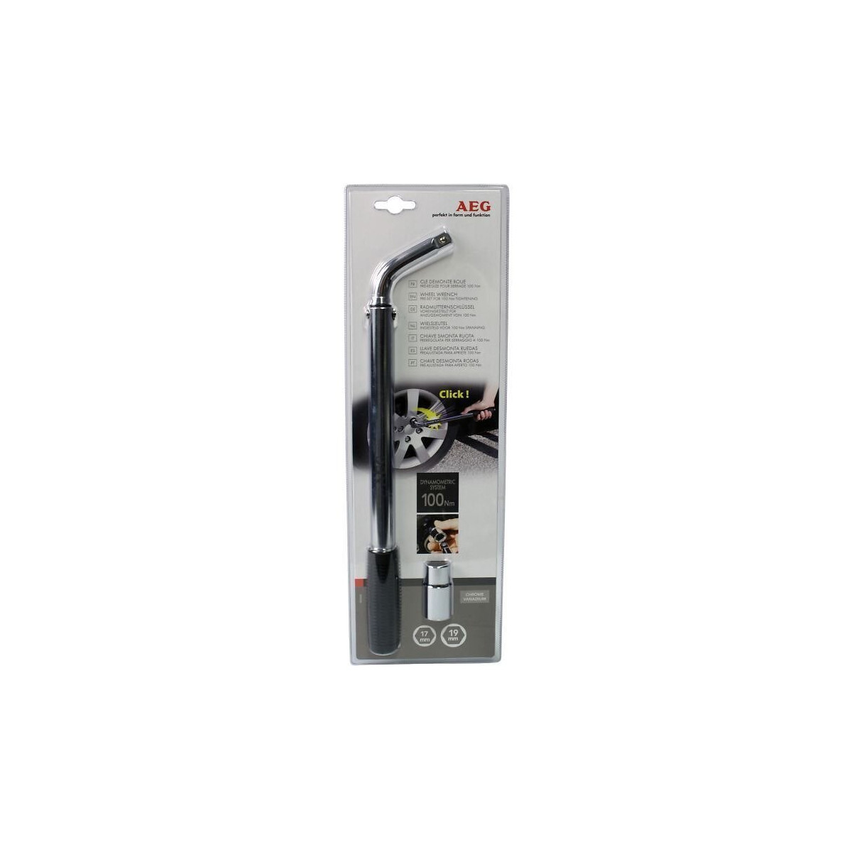 Clé démonte-roue dynamométrique préréglée pour serrage des écrous a 100N/m +/- 4%. Poignée ergonomique plastifiée. Acier au chrome-vanadium. Douille réversible en tailles standards 17 et 19mm. Sécurité : vos écrous de roues seront toujours bien serrés grâ