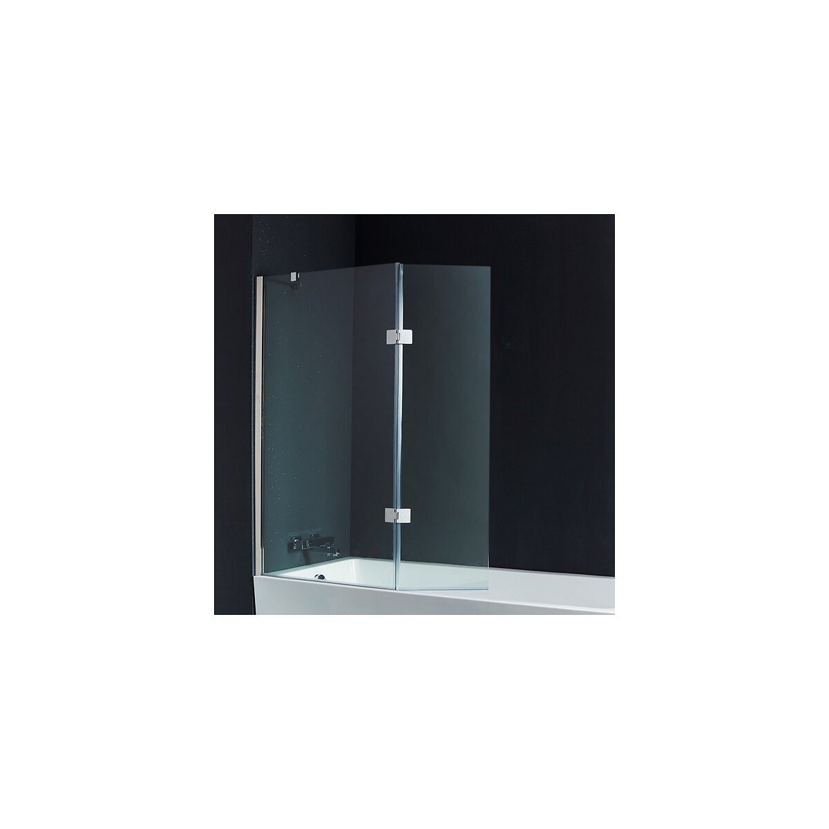 Pare-baignoire 2 volets en verre securit transparent 10 mm Paroi fixe 80 cm Porte mobile 40 cm Profil inox chrome épaisseur 1 mm et largeur 35 mm Traitement anti-trace 1 côté pour la paroi fixe Traitement anti-trace 2 côtés pour la porte mobile Charnières laiton chromé Bras de support inox carré 34 cm Profil mural ajustable 15 mm Produit réversible