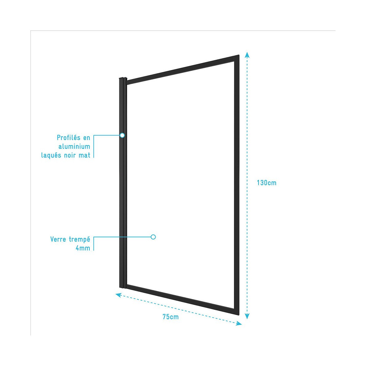 Caractéristiques techniques du pare baignoire: Pare-baignoire 1 volet Profilés noir mat Encadrement aluminium noir mat Fixation murale ajustable +/- 1cm Verre transparent ep. 4mm Installation réversible Dimensions du pare baignoire : 130x75 cm Garantie 2 ans pièces uniquement Profilé noir mat thermolaqué : Le thermolaquage est une technique de traitement spécifique réservé aux matériaux en métal ou en aluminium brut. On projette de la peinture en poudre chargée en électricité statique qui va se déposer sur toute la surface des profilés. Cette technique de pulvérisation en poudre , qui s’appelle projection électrostatique ou poudrage électrostatique, permet d'avoir un revêtement complètement uniforme sur tous les profilés. Ce type de traitement dispense l’utilisation de produits chimiques nocifs pour la santé et l’environnement comme les solvants. Après avoir été recouverte de poudre, la pièce doit passer dans un four où elle sera chauffée pendant 20 minutes à 200°C. Les avantages du thermolaquage : Cette technique possède de nombreux avantage, qui sont La surface peinte possède une dureté supérieure ce qui a pour conséquence une résistance aux chocs accrue Le thermolaquage a une meilleure résistance à la corrosion La couleur des profilés thermolaqués résiste mieux au vieillissement et tout autres élément tel que l'humidité etc. Les profilés thermolaqués présentent une meilleure finition, fini les coulures de peinture et défauts d'aspect, avec cette technique la surface est uniforme Sans solvant c'est un véritable plus pour la santé Mais aussi plus écologique (pas de solvants) Dans un souci de qualité mais aussi de sécurité nos produits répondent à toutes les normes Européennes en vigueur. Que ce soit en terme de sécurité en cas de casse, d'entretien de nos produits ou de la durée de vie de ces derniers, nos produits remplissent tous les critères. Verre trempé : Le verre trempé est un verre qui a subi un traitement afin d’améliorer ses propriétés. Nous utilisons la trempe thermique qui consiste à porter le verre à très haute température (environ à 700 °C), puis de le refroidir rapidement. Ce processus favorise l'apparition de tensions en profondeur et celle de la compression à la surface du verre. Tout cela a pour effet l’amélioration de sa résistance aux chocs. Il est de 2 à 5 fois plus résistant que le verre simple. Mais aussi diminue grandement la dangerosité du verre car en cas de casse le verre explose en de petits morceaux et non pas en de grands pans tranchants. Pour le reste il conserve les mêmes propriétés que le verre classique Norme harmonisée : EN14428:2004 Certification Européenne: Aptitude au nettoyage : EN14428 :2004+A1:2008 Clause 4.2 Résistance à l’impact / Propriétés d’éclatement: EN14428:2004+A1:2008 Clause 4.3 Durabilité : EN14428:2004+A1:2008 Clause 4.4 MyShowerRoom c’est aussi la garantie de durabilité : Nous garantissons un stocks de pièces détachées d’au moins 5 ans Notre visserie est en acier inoxydable ce qui est une garantie anticorrosion Garantie 2 ans pièces uniquement Cocorico ! MyShowerRoom est une entreprise Française et toute la conception de nos produits est également Française. Ce qui est un véritable plus pour être au plus près de ses clients et avoir une meilleure connaissance de leurs attentes. Qui sommes nous L’HISTOIRE DE MYSHOWERROOM Nous avons créé MyShowerRoom en 2003 avec l’ambition de démocratiser le design et l’innovation dans la salle de bain pour faire de cette pièce un lieu à part entière, un véritable lieu d’histoires à vivre pour toute la famille. Nos cabines de douche et meubles de salle de bain dans l’ère du temps à des tarifs très accessibles. Nos nombreux brevets garantissent l’originalité de notre gamme de cabines de douches. Et nos ingénieurs mettent en œuvre tout leur savoir-faire et toutes les technologies innovantes au service d’une simplicité d’installation et d’utilisation incomparable pour tous. ÊTRE BIENVEILLANT AVEC NOS CLIENTS Notre service client a un objectif : rendre nos clients heureux. Pour cela nous veillons à répondre dans les 24h aux demandes clients. Mais aussi de toujours apporter une solution et entière satisfaction à nos clients. CONSTRUIRE DES PRODUITS TOUJOURS PLUS PERFORMANTS Nos ingénieurs, ainsi que nos équipes terrain consacrent tous leurs efforts à créer des produits adaptés à vos besoins, et toujours plus innovants grâce à nos technologies. Notre objectif est d’être votre unique interlocuteur pour tous vos projets de salle de bain. CONCRÉTISER LES RÊVES DE CHACUN Un projet de salle de bain ? Nous le réalisons ! Lieu de détente et de relaxation par excellence, la salle de bain est une des pièces maîtresse de la maison. Chez MyShowerRoom, nous mettons tout en oeuvre afin que ce rêve devienne réalité. PROPOSER UNE GAMME COMPLÈTE DE PRODUITS Nous vous proposons grâce à notre boutique en ligne une gamme complète de produits Made in MyShowerRoom pour équiper, et accessoiriser votre salle de bain. Un catalogue que nous renouvelons régulièrement avec les dernières technologies MyShowerRoom. APPORTER UNE EXPERTISE HUMAINE Parce que l’humain passe avant tout, nous travaillons avec les meilleurs experts. La satisfaction de nos clients est notre seule et unique priorité. Chaque problème a une solution, et c’est dans cette optique que nous avons mis en place un chat pour échanger directement avec nos équipes. NOTRE CENTRE LOGISTIQUE 11 000 m² d’entrepôt 7000 palettes en stock 1 800 colis traités par jour Plus de 260 préparations de commandes quotidiennes 12 quais de chargement/déchargement CONSEILS & VENTES Une équipe disponible 5 jours sur 7 pour vous accompagner dans vos achats. LIVRAISON GRATUITE Pour toute commande sur le site MyShowerRoom, la livraison est gratuite dans toute la France. UNE GARANTIE DE QUALITÉ Gr