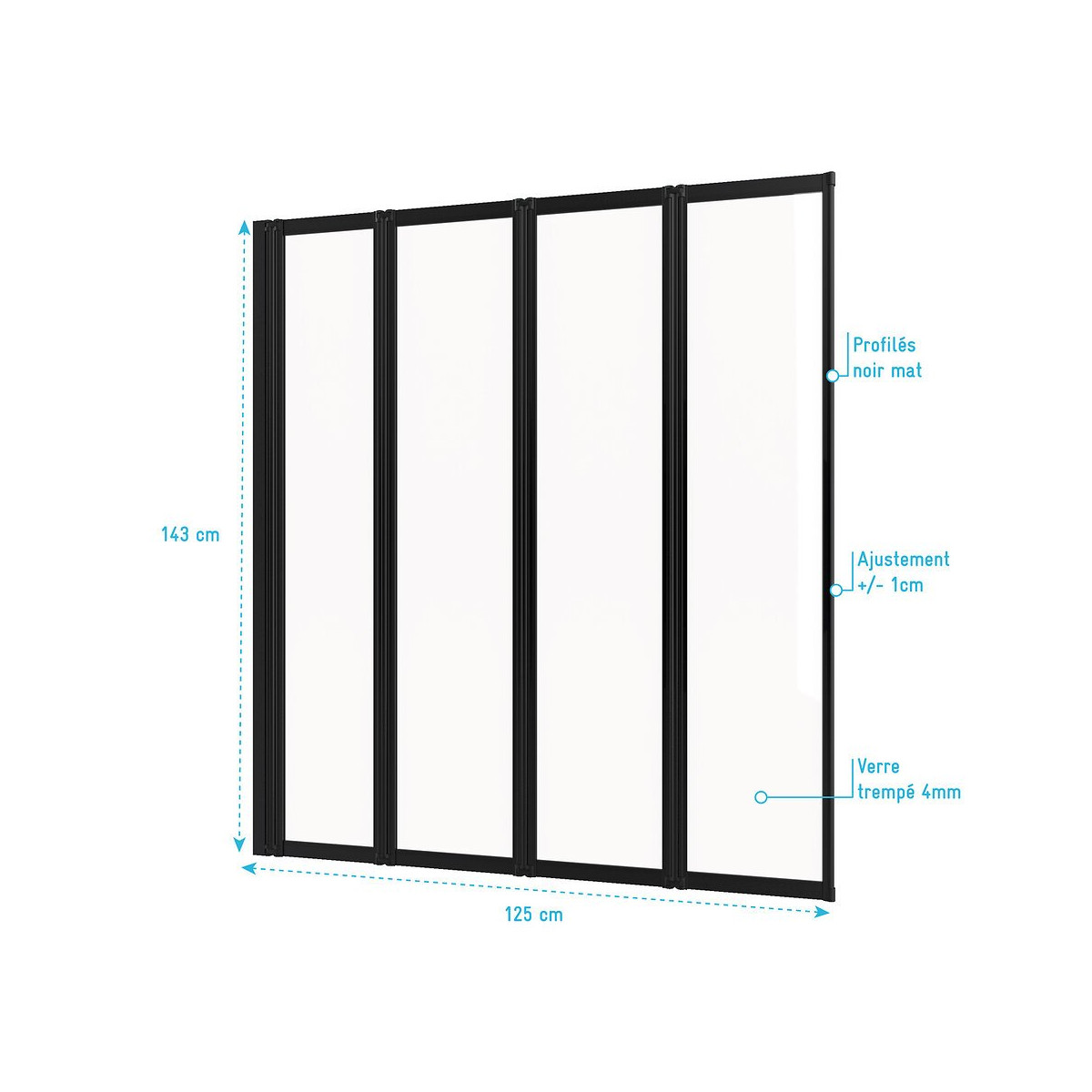 Caractéristique du produit : Pare baignoire 4 volets pivotants Profilés noir mat Ajustement +/-1 cm Verre trempé transparent 4mm Dimensions du pare baignoire : Dimensions : 125x143 cm Largeur : 125 cm Hauteur : 143 cm Garantie 2 ans pièces et non main d'oeuvre. Profilé noir mat thermolaqué : Le thermolaquage est une technique de traitement spécifique réservé aux matériaux en métal ou en aluminium brut. On projette de la peinture en poudre chargée en électricité statique qui va se déposer sur toute la surface des profilés. Cette technique de pulvérisation en poudre , qui s’appelle projection électrostatique ou poudrage électrostatique, permet d'avoir un revêtement complètement uniforme sur tous les profilés. Ce type de traitement dispense l’utilisation de produits chimiques nocifs pour la santé et l’environnement comme les solvants. Après avoir été recouverte de poudre, la pièce doit passer dans un four où elle sera chauffée pendant 20 minutes à 200°C. Les avantages du thermolaquage : Cette technique possède de nombreux avantage, qui sont La surface peinte possède une dureté supérieure ce qui a pour conséquence une résistance aux chocs accrue Le thermolaquage a une meilleure résistance à la corrosion La couleur des profilés thermolaqués résiste mieux au vieillisement et tout autres élément tel que l'humidité etc. Les profilés thermolaqués présentent une meilleure finition, fini les coulures de peinture et défauts d'aspect, avec cette technique la surface est uniforme Sans solvant c'est un véritable plus pour la santé Mais aussi plus écologique (pas de solvants) Dans un souci de qualité mais aussi de sécurité nos produits répondent à toutes les normes Européennes en vigeur. Que ce soit en terme de sécurité en cas de casse, d'entretien de nos produits ou de la durée de vie de ces derniers, nos produits remplissent tous les critères. Verre trempé : Le verre trempé est un verre qui a subi un traitement afin d’améliorer ses propriétés. Nous utilisons la trempe thermique qui consiste à porter le verre à très haute température (environ à 700 °C), puis de le refroidir rapidement. Ce processus favorise l'apparition de tensions en profondeur et celle de la compression à la surface du verre. Tout cela a pour effet l’amélioration de sa résistance aux chocs. Il est de 2 à 5 fois plus résistant que le verre simple. Mais aussi diminue grandement la dangerosité du verre car en cas de casse le verre explose en de petits morceaux et non pas en de grands pans tranchants. Pour le reste il conserve les mêmes propriétés que le verre classique Norme harmonisée : EN14428:2004 Certification Européenne: Aptitude au nettoyage : EN14428 :2004+A1:2008 Clause 4.2 Résistance à l’impact / Propriétés d’éclatement: EN14428:2004+A1:2008 Clause 4.3 Durabilité : EN14428:2004+A1:2008 Clause 4.4 MyShowerRoom c’est aussi la garantie de durabilité : Nous garantissons un stocks de pièces détachées d’au moins 5 ans Notre visserie est en acier inoxydable ce qui est une garantie anticorrosion Garantie 2 ans pièces uniquement Cocorico ! MyShowerRoom est une entreprise Française et toute la conception de nos produits est également Française. Ce qui est un véritable plus pour être au plus près de ses clients et avoir une meilleure connaissance de leurs attentes. Qui sommes nous L’HISTOIRE DE MYSHOWERROOM Nous avons créé MyShowerRoom en 2003 avec l’ambition de démocratiser le design et l’innovation dans la salle de bain pour faire de cette pièce un lieu à part entière, un véritable lieu d’histoires à vivre pour toute la famille. Nos cabines de douche et meubles de salle de bain dans l’ère du temps à des tarifs très accessibles. Nos nombreux brevets garantissent l’originalité de notre gamme de cabines de douches. Et nos ingénieurs mettent en œuvre tout leur savoir-faire et toutes les technologies innovantes au service d’une simplicité d’installation et d’utilisation incomparable pour tous. ÊTRE BIENVEILLANT AVEC NOS CLIENTS Notre service client a un objectif : rendre nos clients heureux. Pour cela nous veillons à répondre dans les 24h aux demandes clients. Mais aussi de toujours apporter une solution et entière satisfaction à nos clients. CONSTRUIRE DES PRODUITS TOUJOURS PLUS PERFORMANTS Nos ingénieurs, ainsi que nos équipes terrain consacrent tous leurs efforts à créer des produits adaptés à vos besoins, et toujours plus innovants grâce à nos technologies. Notre objectif est d’être votre unique interlocuteur pour tous vos projets de salle de bain. CONCRÉTISER LES RÊVES DE CHACUN Un projet de salle de bain ? Nous le réalisons ! Lieu de détente et de relaxation par excellence, la salle de bain est une des pièces maîtresse de la maison. Chez MyShowerRoom, nous mettons tout en oeuvre afin que ce rêve devienne réalité. PROPOSER UNE GAMME COMPLÈTE DE PRODUITS Nous vous proposons grâce à notre boutique en ligne une gamme complète de produits Made in MyShowerRoom pour équiper, et accessoiriser votre salle de bain. Un catalogue que nous renouvelons régulièrement avec les dernières technologies MyShowerRoom. APPORTER UNE EXPERTISE HUMAINE Parce que l’humain passe avant tout, nous travaillons avec les meilleurs experts. La satisfaction de nos clients est notre seule et unique priorité. Chaque problème a une solution, et c’est dans cette optique que nous avons mis en place un chat pour échanger directement avec nos équipes. NOTRE CENTRE LOGISTIQUE 11 000 m² d’entrepôt 7000 palettes en stock 1 800 colis traités par jour Plus de 260 préparations de commandes quotidiennes 12 quais de chargement/déchargement CONSEILS & VENTES Une équipe disponible 5 jours sur 7 pour vous accompagner dans vos achats. LIVRAISON GRATUITE Pour toute commande sur le site MyShowerRoom, la livraison est gratuite dans toute la France. UNE GARANTIE DE QUALITÉ Grâce à nos produi