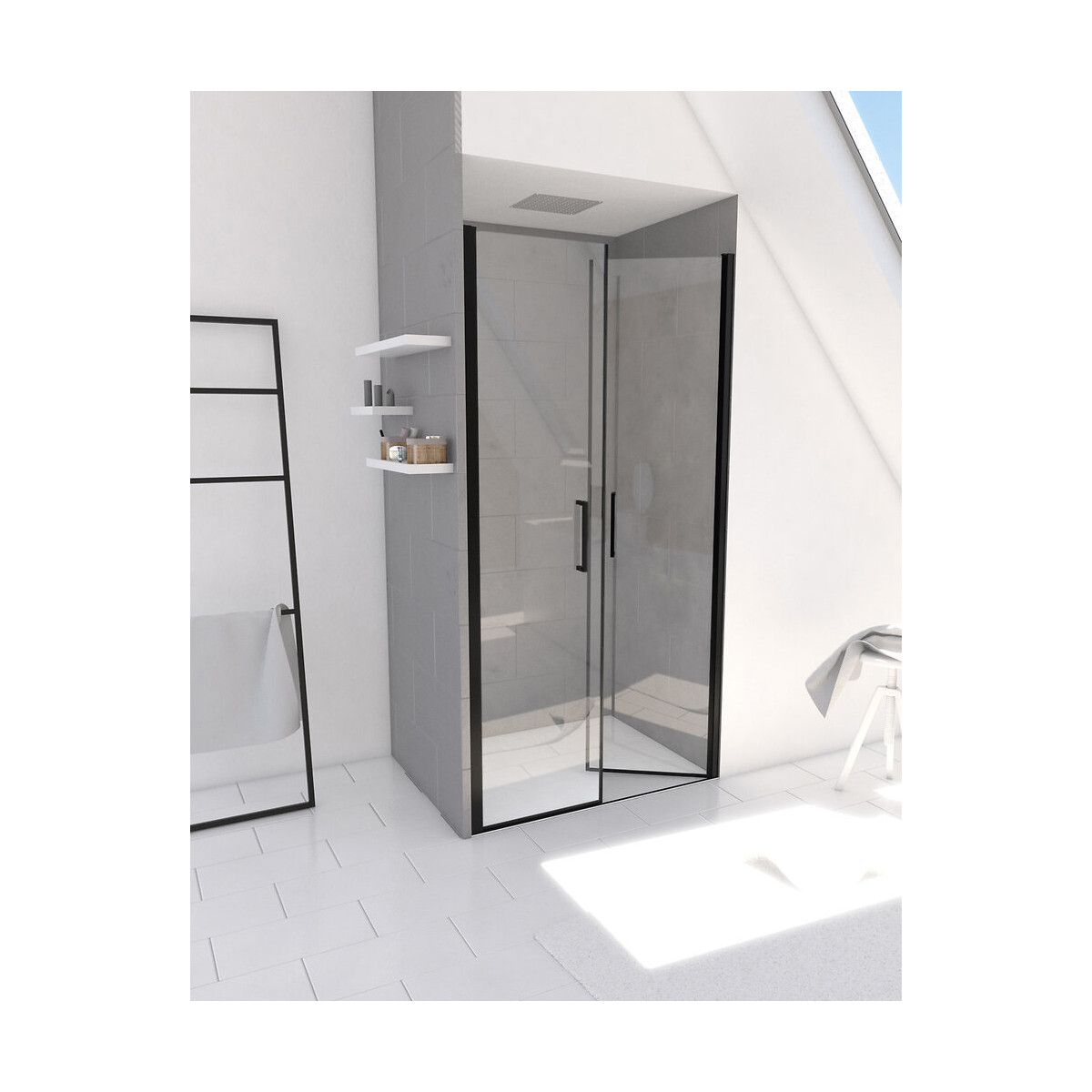Type de porte de douche : battante. Hauteur : 200 cm. Largeur : 90 cm. Profilés aluminium noir mat. Autres dimensions : 70 et 80 cm de largeur.Spécifications techniques