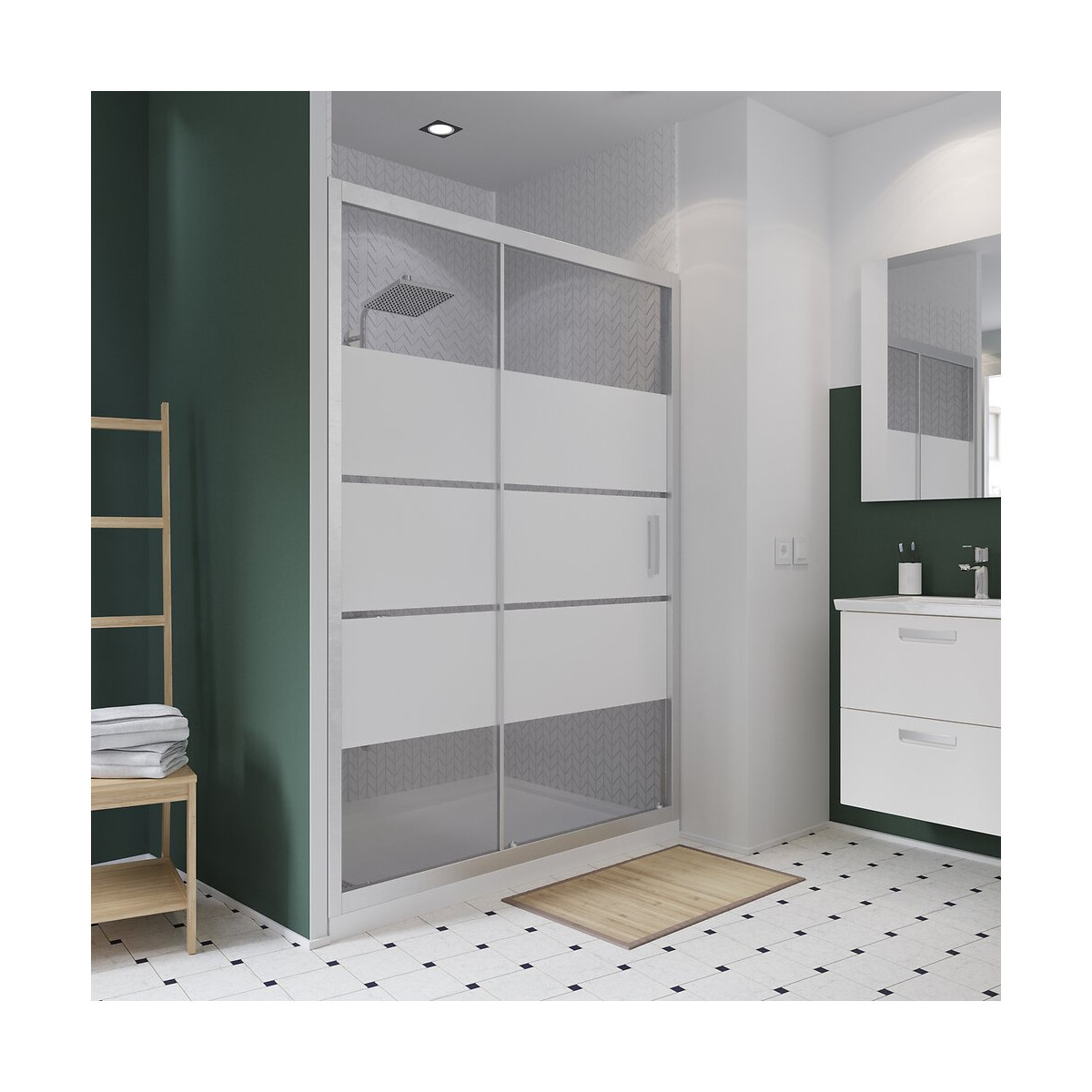 Porte coulissante (1 paroi fixe + 1 porte) 100 x 190cm. Caractéristiques: Profilé: aluminium chromé brossé + un profilé cache vis Verre trempé sécurit 6mm avec bande dépoli Ajustable sur 1.5cm RéversibleSpécifications techniques
