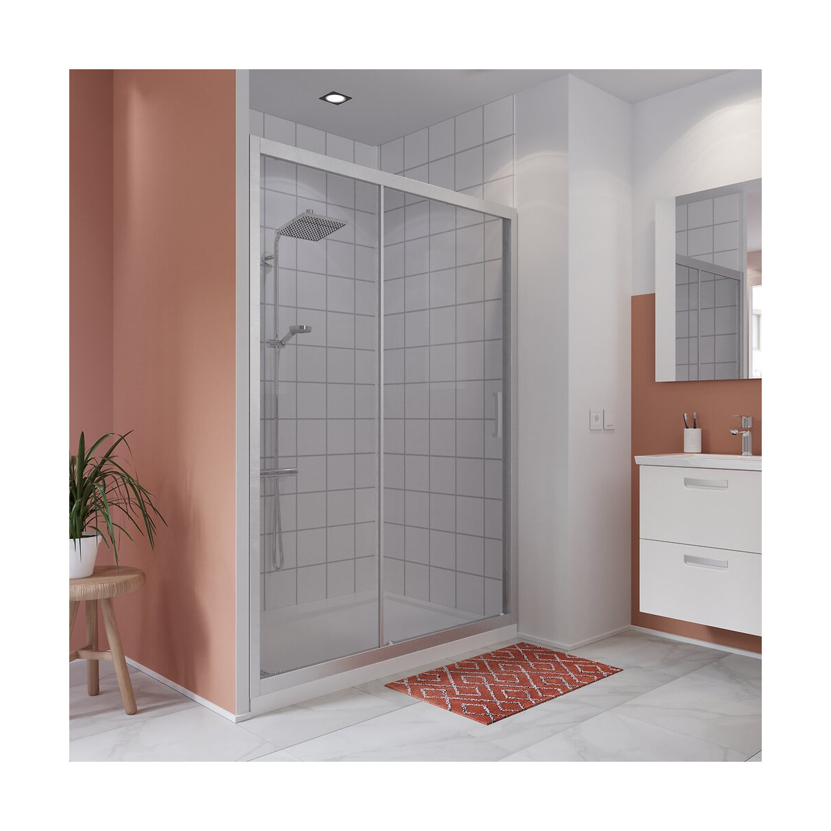 Porte coulissante (1 paroi fixe + 1 porte) 100 x 190cm. Caractéristiques: Profilé: aluminium chromé brossé + un profilé cache vis Verre trempé sécurit 6mm transparent Ajustable sur 1.5cm RéversibleSpécifications techniques