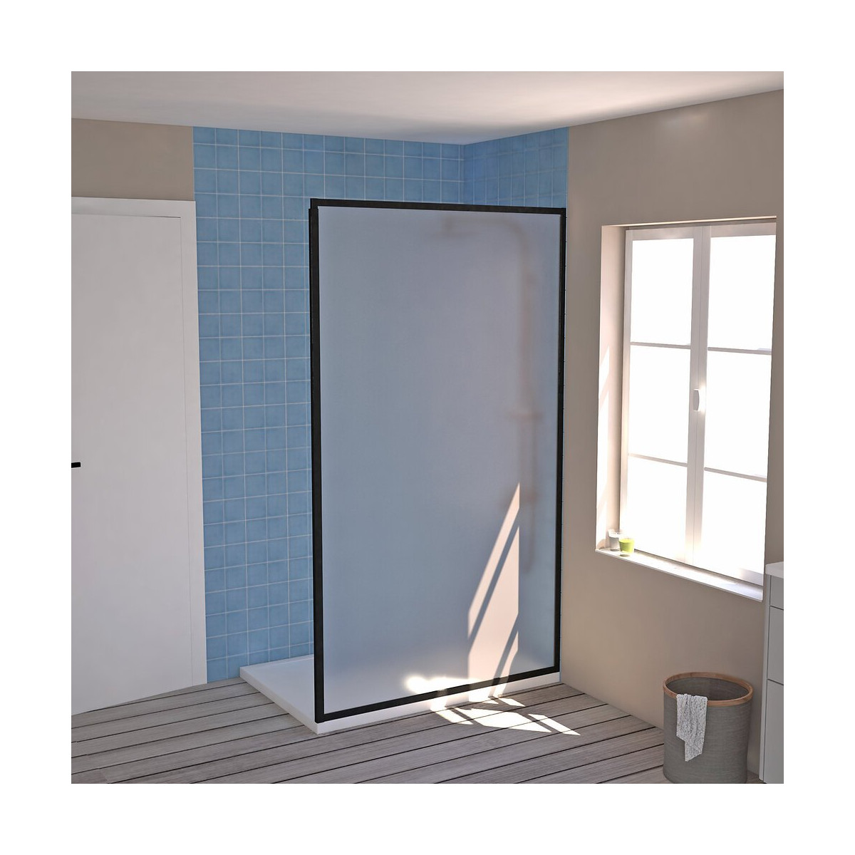 Paroi de douche fixe - largeur 120cm profilés noir mat - hauteur 200 cm avec cadre extensible jusqu'à 265 cm - verre trempé épaisseur 6mm avec 1 face givrée et une face avec traitement Easyclean