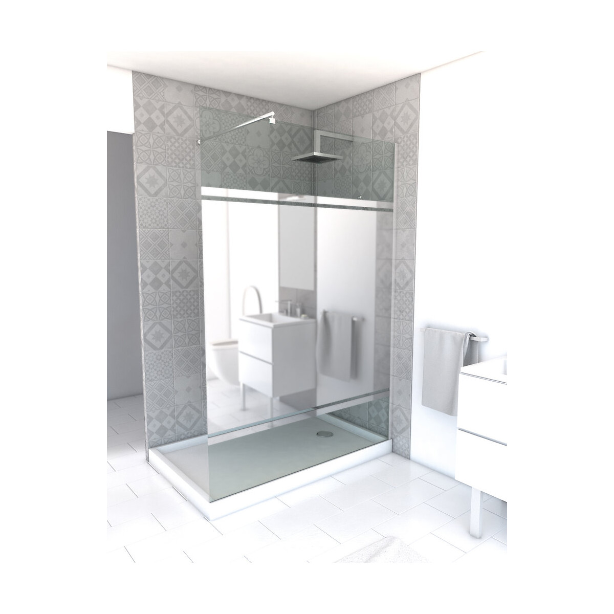 - Verre trempé 8mm avec bande miroir - Profilé aluminium anodisé brillant - Fixation murale ajustable jusqu’à -1cm (largeur totale de 139 à 140cm) - Installation réversible - Barre de fixation non incluse, vendue séparémentSpécifications techniques