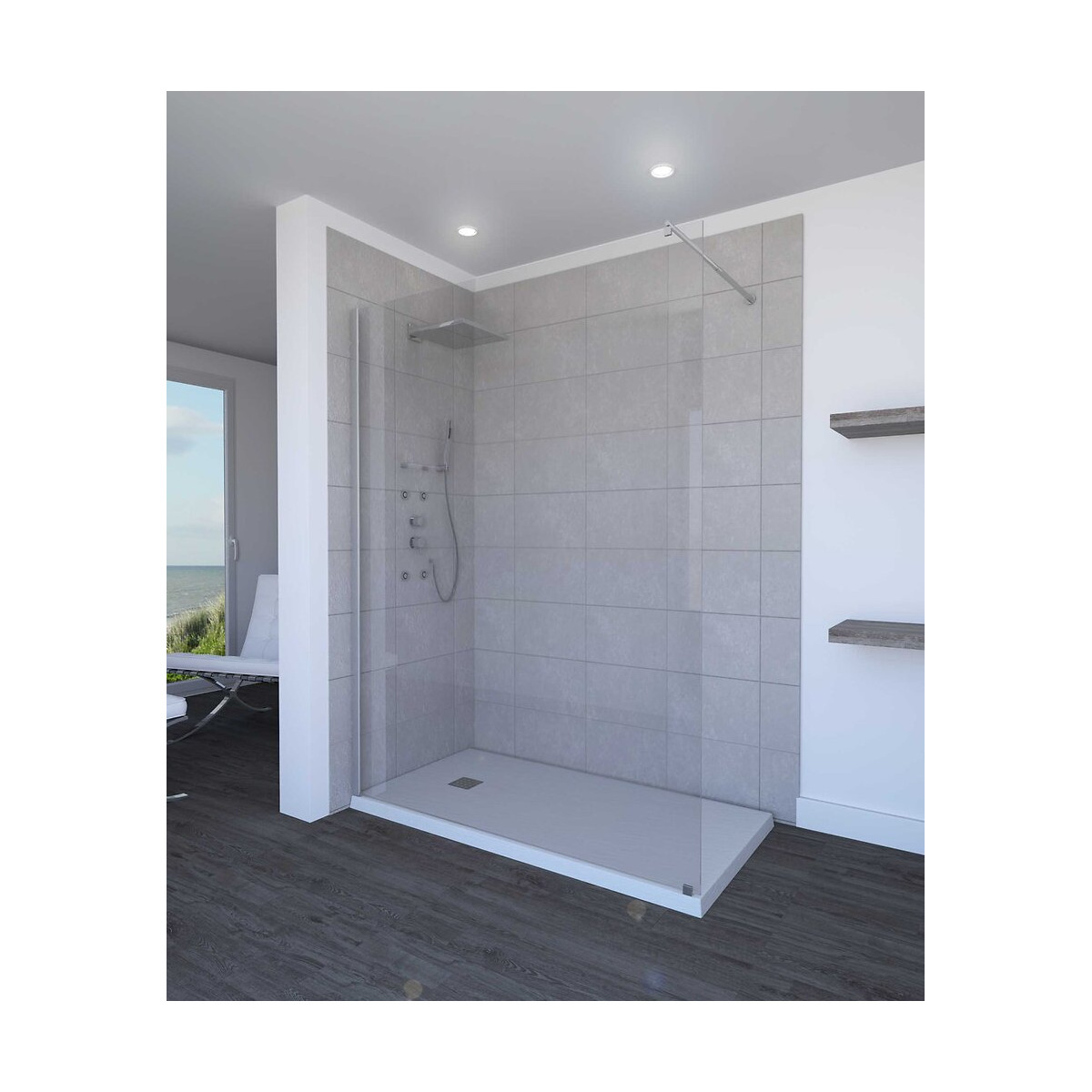 Paroi en verre avec douche à l'italienne AURLANE. Caractéristiques : Profilé de fixation murale ajustable Bras de maintient en inox extensible 80-100 cm Verre sécurit transparent 8 mm Dimensions : Longueur 200 cm Largeur 140 cm Poids : 50 kg