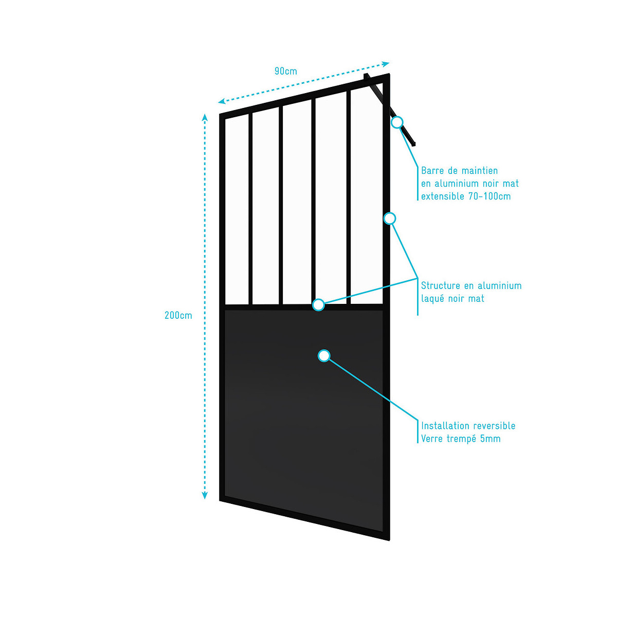 Paroi de douche GLASSY 90 Caractéristiques de la paroi : Barre de maintien en aluminium noir mat extensible 70-100cm Structure en aluminium laqué noir mat Installation réversible Verre trempé ép. 5mm Dimensions 90x200 cm Réference du produit: FAC504 Désignation du produit: GLASSY 90 Garantie 2 ans pièces et non main d'oeuvre. Profilé noir mat thermolaqué : Le thermolaquage est une technique de traitement spécifique réservé aux matériaux en métal ou en aluminium brut. On projette de la peinture en poudre chargée en électricité statique qui va se déposer sur toute la surface des profilés. Cette technique de pulvérisation en poudre , qui s’appelle projection électrostatique ou poudrage électrostatique, permet d'avoir un revêtement complètement uniforme sur tous les profilés. Ce type de traitement dispense l’utilisation de produits chimiques nocifs pour la santé et l’environnement comme les solvants. Après avoir été recouverte de poudre, la pièce doit passer dans un four où elle sera chauffée pendant 20 minutes à 200°C. Les avantages du thermolaquage : Cette technique possède de nombreux avantage, qui sont La surface peinte possède une dureté supérieure ce qui a pour conséquence une résistance aux chocs accrue Le thermolaquage a une meilleure résistance à la corrosion La couleur des profilés thermolaqués résiste mieux au vieillisement et tout autres élément tel que l'humidité etc. Les profilés thermolaqués présentent une meilleure finition, fini les coulures de peinture et défauts d'aspect, avec cette technique la surface est uniforme Sans solvant c'est un véritable plus pour la santé Mais aussi plus écologique (pas de solvants) Dans un souci de qualité mais aussi de sécurité nos produits répondent à toutes les normes Européennes en vigeur. Que ce soit en terme de sécurité en cas de casse, d'entretien de nos produits ou de la durée de vie de ces derniers, nos produits remplissent tous les critères. Verre trempé : Le verre trempé est un verre qui a subi un traitement afin d’améliorer ses propriétés. Nous utilisons la trempe thermique qui consiste à porter le verre à très haute température (environ à 700 °C), puis de le refroidir rapidement. Ce processus favorise l'apparition de tensions en profondeur et celle de la compression à la surface du verre. Tout cela a pour effet l’amélioration de sa résistance aux chocs. Il est de 2 à 5 fois plus résistant que le verre simple. Mais aussi diminue grandement la dangerosité du verre car en cas de casse le verre explose en de petits morceaux et non pas en de grands pans tranchants. Pour le reste il conserve les mêmes propriétés que le verre classique Norme harmonisée : EN14428:2004 Certification Européenne: Aptitude au nettoyage : EN14428 :2004+A1:2008 Clause 4.2 Résistance à l’impact / Propriétés d’éclatement: EN14428:2004+A1:2008 Clause 4.3 Durabilité : EN14428:2004+A1:2008 Clause 4.4 MyShowerRoom c’est aussi la garantie de durabilité : Nous garantissons un stocks de pièces détachées d’au moins 5 ans Notre visserie est en acier inoxydable ce qui est une garantie anticorrosion Garantie 2 ans pièces uniquement Cocorico ! MyShowerRoom est une entreprise Française et toute la conception de nos produits est également Française. Ce qui est un véritable plus pour être au plus près de ses clients et avoir une meilleure connaissance de leurs attentes. Qui sommes nous L’HISTOIRE DE MYSHOWERROOM Nous avons créé MyShowerRoom en 2003 avec l’ambition de démocratiser le design et l’innovation dans la salle de bain pour faire de cette pièce un lieu à part entière, un véritable lieu d’histoires à vivre pour toute la famille. Nos cabines de douche et meubles de salle de bain dans l’ère du temps à des tarifs très accessibles. Nos nombreux brevets garantissent l’originalité de notre gamme de cabines de douches. Et nos ingénieurs mettent en œuvre tout leur savoir-faire et toutes les technologies innovantes au service d’une simplicité d’installation et d’utilisation incomparable pour tous. ÊTRE BIENVEILLANT AVEC NOS CLIENTS Notre service client a un objectif : rendre nos clients heureux. Pour cela nous veillons à répondre dans les 24h aux demandes clients. Mais aussi de toujours apporter une solution et entière satisfaction à nos clients. CONSTRUIRE DES PRODUITS TOUJOURS PLUS PERFORMANTS Nos ingénieurs, ainsi que nos équipes terrain consacrent tous leurs efforts à créer des produits adaptés à vos besoins, et toujours plus innovants grâce à nos technologies. Notre objectif est d’être votre unique interlocuteur pour tous vos projets de salle de bain. CONCRÉTISER LES RÊVES DE CHACUN Un projet de salle de bain ? Nous le réalisons ! Lieu de détente et de relaxation par excellence, la salle de bain est une des pièces maîtresse de la maison. Chez MyShowerRoom, nous mettons tout en oeuvre afin que ce rêve devienne réalité. PROPOSER UNE GAMME COMPLÈTE DE PRODUITS Nous vous proposons grâce à notre boutique en ligne une gamme complète de produits Made in MyShowerRoom pour équiper, et accessoiriser votre salle de bain. Un catalogue que nous renouvelons régulièrement avec les dernières technologies MyShowerRoom. APPORTER UNE EXPERTISE HUMAINE Parce que l’humain passe avant tout, nous travaillons avec les meilleurs experts. La satisfaction de nos clients est notre seule et unique priorité. Chaque problème a une solution, et c’est dans cette optique que nous avons mis en place un chat pour échanger directement avec nos équipes. NOTRE CENTRE LOGISTIQUE 11 000 m² d’entrepôt 7000 palettes en stock 1 800 colis traités par jour Plus de 260 préparations de commandes quotidiennes 12 quais de chargement/déchargement CONSEILS & VENTES Une équipe disponible 5 jours sur 7 pour vous accompagner dans vos achats. LIVRAISON GRATUITE Pour toute commande sur le site MyShowerRoom, la livraison est gratui