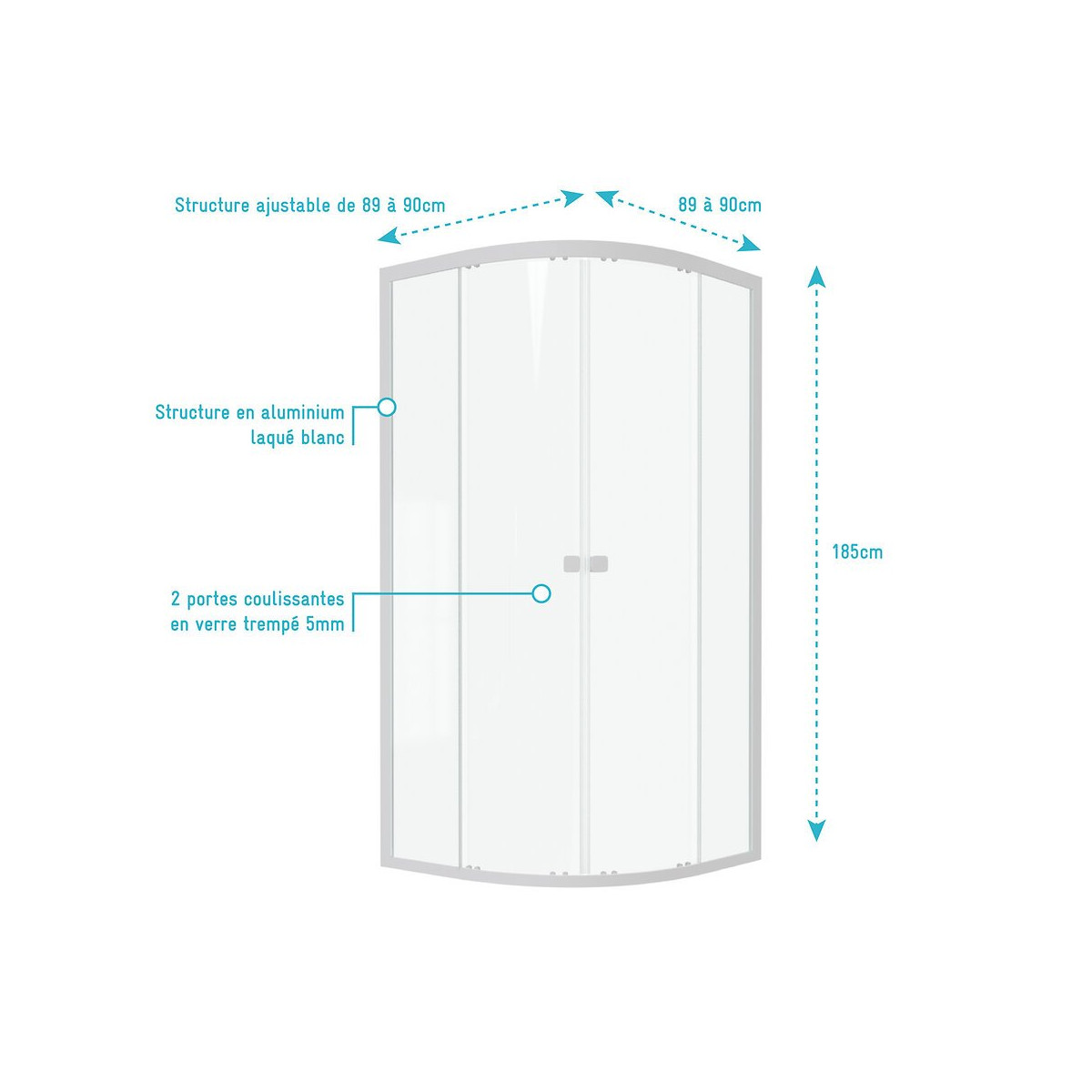 Porte de douche 1/4 de cercle WHITY ROUND 90 ROUND Caractéristiques des portes de douche 2 parois fixes et 2 parois coulissantes Verre trempé 5mm transparent Structure en aluminium laqué blanc Poignées doubles carrées blanches Fermeture magnétique Dimensions 90x90x185 cm Référence : FAC491 Désignation produit : WHITY ROUND Garantie 2 ans pièces et non main d'oeuvre. Verre trempé : Le verre trempé est un verre qui a subi un traitement afin d’améliorer ses propriétés. Nous utilisons la trempe thermique qui consiste à porter le verre à très haute température (environ à 700 °C), puis de le refroidir rapidement. Ce processus favorise l'apparition de tensions en profondeur et celle de la compression à la surface du verre. Tout cela a pour effet l’amélioration de sa résistance aux chocs. Il est de 2 à 5 fois plus résistant que le verre simple. Mais aussi diminue grandement la dangerosité du verre car en cas de casse le verre explose en de petits morceaux et non pas en de grands pans tranchants. Pour le reste il conserve les mêmes propriétés que le verre classique Norme harmonisée : EN14428:2004 Certification Européenne: Aptitude au nettoyage : EN14428 :2004+A1:2008 Clause 4.2 Résistance à l’impact / Propriétés d’éclatement: EN14428:2004+A1:2008 Clause 4.3 Durabilité : EN14428:2004+A1:2008 Clause 4.4 MyShowerRoom c’est aussi la garantie de durabilité : Nous garantissons un stocks de pièces détachées d’au moins 5 ans Notre visserie est en acier inoxydable ce qui est une garantie anticorrosion Garantie 2 ans pièces uniquement Cocorico ! MyShowerRoom est une entreprise Française et toute la conception de nos produits est également Française. Ce qui est un véritable plus pour être au plus près de ses clients et avoir une meilleure connaissance de leurs attentes. Qui sommes nous L’HISTOIRE DE MYSHOWERROOM Nous avons créé MyShowerRoom en 2003 avec l’ambition de démocratiser le design et l’innovation dans la salle de bain pour faire de cette pièce un lieu à part entière, un véritable lieu d’histoires à vivre pour toute la famille. Nos cabines de douche et meubles de salle de bain dans l’ère du temps à des tarifs très accessibles. Nos nombreux brevets garantissent l’originalité de notre gamme de cabines de douches. Et nos ingénieurs mettent en œuvre tout leur savoir-faire et toutes les technologies innovantes au service d’une simplicité d’installation et d’utilisation incomparable pour tous. ÊTRE BIENVEILLANT AVEC NOS CLIENTS Notre service client a un objectif : rendre nos clients heureux. Pour cela nous veillons à répondre dans les 24h aux demandes clients. Mais aussi de toujours apporter une solution et entière satisfaction à nos clients. CONSTRUIRE DES PRODUITS TOUJOURS PLUS PERFORMANTS Nos ingénieurs, ainsi que nos équipes terrain consacrent tous leurs efforts à créer des produits adaptés à vos besoins, et toujours plus innovants grâce à nos technologies. Notre objectif est d’être votre unique interlocuteur pour tous vos projets de salle de bain. CONCRÉTISER LES RÊVES DE CHACUN Un projet de salle de bain ? Nous le réalisons ! Lieu de détente et de relaxation par excellence, la salle de bain est une des pièces maîtresse de la maison. Chez MyShowerRoom, nous mettons tout en oeuvre afin que ce rêve devienne réalité. PROPOSER UNE GAMME COMPLÈTE DE PRODUITS Nous vous proposons grâce à notre boutique en ligne une gamme complète de produits Made in MyShowerRoom pour équiper, et accessoiriser votre salle de bain. Un catalogue que nous renouvelons régulièrement avec les dernières technologies MyShowerRoom. APPORTER UNE EXPERTISE HUMAINE Parce que l’humain passe avant tout, nous travaillons avec les meilleurs experts. La satisfaction de nos clients est notre seule et unique priorité. Chaque problème a une solution, et c’est dans cette optique que nous avons mis en place un chat pour échanger directement avec nos équipes. NOTRE CENTRE LOGISTIQUE 11 000 m² d’entrepôt 7000 palettes en stock 1 800 colis traités par jour Plus de 260 préparations de commandes quotidiennes 12 quais de chargement/déchargement CONSEILS & VENTES Une équipe disponible 5 jours sur 7 pour vous accompagner dans vos achats. LIVRAISON GRATUITE Pour toute commande sur le site MyShowerRoom, la livraison est gratuite dans toute la France. UNE GARANTIE DE QUALITÉ Grâce à nos produits brevetés vous bénéficiez de produits uniques. Référence produit: FAC491 Retrouvez plus d'informations produit et des conseils de montage sur le site Aurlane. Remarques importantes: Ces colis sont volumineux, la livraison est effectuée par transporteur spécialisé en bas de chez vous. Les chauffeurs ne sont pas habilités à porter la marchandise, mais uniquement à la décharger. Pas de livraison à l'étage. L'adresse de livraison doit être accessible en camion poids lourd. Dans le cas contraire la marchandise sera mise à disposition au dépôt le plus proche (distance non garantie). Les rendez-vous sont gérés directement par les transporteurs. Attention à bien contrôler la marchandise à réception pour éviter tous litiges.