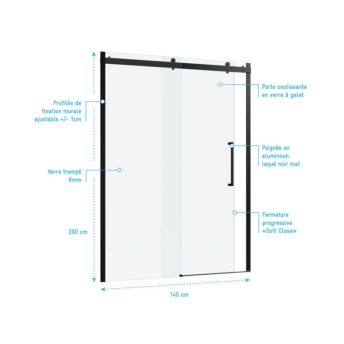 Caractéristiques Paroi de douche type industriel 1 porte coulissante en verre trempé 8mm transparent Roulement à galet noir mat Profilés de fixation murale ajustables de -2cm noir mat Verre trempé 8mm transparent Poignée en aluminium laquée noir mat Sens d'ouverture réversible Fermeture ‘‘soft close’’ Dimensions 140x200cm Plus produit : Fermeture progressive (Soft close) fini les portes qui claquent ! Verre 8mm Systeme de roulement type industriel design Désignation : RAILROAD DARK FRONT 140 Référence: FAC358 Garantie 2 ans pièces et non main d'oeuvre. Profilé noir mat thermolaqué : Le thermolaquage est une technique de traitement spécifique réservé aux matériaux en métal ou en aluminium brut. On projette de la peinture en poudre chargée en électricité statique qui va se déposer sur toute la surface des profilés. Cette technique de pulvérisation en poudre , qui s’appelle projection électrostatique ou poudrage électrostatique, permet d'avoir un revêtement complètement uniforme sur tous les profilés. Ce type de traitement dispense l’utilisation de produits chimiques nocifs pour la santé et l’environnement comme les solvants. Après avoir été recouverte de poudre, la pièce doit passer dans un four où elle sera chauffée pendant 20 minutes à 200°C. Les avantages du thermolaquage : Cette technique possède de nombreux avantage, qui sont La surface peinte possède une dureté supérieure ce qui a pour conséquence une résistance aux chocs accrue Le thermolaquage a une meilleure résistance à la corrosion La couleur des profilés thermolaqués résiste mieux au vieillisement et tout autres élément tel que l'humidité etc. Les profilés thermolaqués présentent une meilleure finition, fini les coulures de peinture et défauts d'aspect, avec cette technique la surface est uniforme Sans solvant c'est un véritable plus pour la santé Mais aussi plus écologique (pas de solvants) Dans un souci de qualité mais aussi de sécurité nos produits répondent à toutes les normes Européennes en vigeur. Que ce soit en terme de sécurité en cas de casse, d'entretien de nos produits ou de la durée de vie de ces derniers, nos produits remplissent tous les critères. Verre trempé : Le verre trempé est un verre qui a subi un traitement afin d’améliorer ses propriétés. Nous utilisons la trempe thermique qui consiste à porter le verre à très haute température (environ à 700 °C), puis de le refroidir rapidement. Ce processus favorise l'apparition de tensions en profondeur et celle de la compression à la surface du verre. Tout cela a pour effet l’amélioration de sa résistance aux chocs. Il est de 2 à 5 fois plus résistant que le verre simple. Mais aussi diminue grandement la dangerosité du verre car en cas de casse le verre explose en de petits morceaux et non pas en de grands pans tranchants. Pour le reste il conserve les mêmes propriétés que le verre classique Norme harmonisée : EN14428:2004 Certification Européenne: Aptitude au nettoyage : EN14428 :2004+A1:2008 Clause 4.2 Résistance à l’impact / Propriétés d’éclatement: EN14428:2004+A1:2008 Clause 4.3 Durabilité : EN14428:2004+A1:2008 Clause 4.4 MyShowerRoom c’est aussi la garantie de durabilité : Nous garantissons un stocks de pièces détachées d’au moins 5 ans Notre visserie est en acier inoxydable ce qui est une garantie anticorrosion Garantie 2 ans pièces uniquement Cocorico ! MyShowerRoom est une entreprise Française et toute la conception de nos produits est également Française. Ce qui est un véritable plus pour être au plus près de ses clients et avoir une meilleure connaissance de leurs attentes. Qui sommes nous L’HISTOIRE DE MYSHOWERROOM Nous avons créé MyShowerRoom en 2003 avec l’ambition de démocratiser le design et l’innovation dans la salle de bain pour faire de cette pièce un lieu à part entière, un véritable lieu d’histoires à vivre pour toute la famille. Nos cabines de douche et meubles de salle de bain dans l’ère du temps à des tarifs très accessibles. Nos nombreux brevets garantissent l’originalité de notre gamme de cabines de douches. Et nos ingénieurs mettent en œuvre tout leur savoir-faire et toutes les technologies innovantes au service d’une simplicité d’installation et d’utilisation incomparable pour tous. ÊTRE BIENVEILLANT AVEC NOS CLIENTS Notre service client a un objectif : rendre nos clients heureux. Pour cela nous veillons à répondre dans les 24h aux demandes clients. Mais aussi de toujours apporter une solution et entière satisfaction à nos clients. CONSTRUIRE DES PRODUITS TOUJOURS PLUS PERFORMANTS Nos ingénieurs, ainsi que nos équipes terrain consacrent tous leurs efforts à créer des produits adaptés à vos besoins, et toujours plus innovants grâce à nos technologies. Notre objectif est d’être votre unique interlocuteur pour tous vos projets de salle de bain. CONCRÉTISER LES RÊVES DE CHACUN Un projet de salle de bain ? Nous le réalisons ! Lieu de détente et de relaxation par excellence, la salle de bain est une des pièces maîtresse de la maison. Chez MyShowerRoom, nous mettons tout en oeuvre afin que ce rêve devienne réalité. PROPOSER UNE GAMME COMPLÈTE DE PRODUITS Nous vous proposons grâce à notre boutique en ligne une gamme complète de produits Made in MyShowerRoom pour équiper, et accessoiriser votre salle de bain. Un catalogue que nous renouvelons régulièrement avec les dernières technologies MyShowerRoom. APPORTER UNE EXPERTISE HUMAINE Parce que l’humain passe avant tout, nous travaillons avec les meilleurs experts. La satisfaction de nos clients est notre seule et unique priorité. Chaque problème a une solution, et c’est dans cette optique que nous avons mis en place un chat pour échanger directement avec nos équipes. NOTRE CENTRE LOGISTIQUE 11 000 m² d’entrepôt 7000 palettes en stock 1 800 colis traités par jour Plus de 260 préparations de