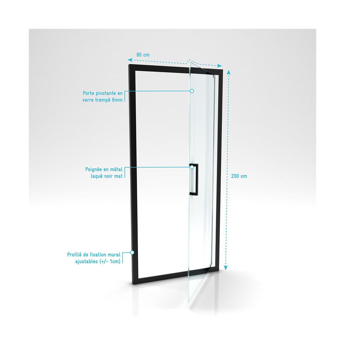 Caractéristiques Structure en aluminium laqué noir mat Profilés de fixation murale ajustables (+ / - 1 cm) Porte pivotante en verre trempé 6 mm transparent Poignée en métal laquée noir mat Fermeture magnétique Montage réversible Attention paroi de retour (paroi latérale) non fournie (disponible à la vente sous la référence FAC285) Dimensions 80x200 cm Référence: FAC287 PLUS PRODUIT: Très tendance, Aurlane propose toute une gamme de parois de douche aux finitions noir mat. La porte pivotante CRUSH en verre trempé de 6mm vous permet une ouverture de porte agréable. Cette porte de douche s'adaptera à tous les styles de salle de bain. Profilé noir mat thermolaqué : Le thermolaquage est une technique de traitement spécifique réservé aux matériaux en métal ou en aluminium brut. On projette de la peinture en poudre chargée en électricité statique qui va se déposer sur toute la surface des profilés. Cette technique de pulvérisation en poudre , qui s’appelle projection électrostatique ou poudrage électrostatique, permet d'avoir un revêtement complètement uniforme sur tous les profilés. Ce type de traitement dispense l’utilisation de produits chimiques nocifs pour la santé et l’environnement comme les solvants. Après avoir été recouverte de poudre, la pièce doit passer dans un four où elle sera chauffée pendant 20 minutes à 200°C. Les avantages du thermolaquage : Cette technique possède de nombreux avantage, qui sont La surface peinte possède une dureté supérieure ce qui a pour conséquence une résistance aux chocs accrue Le thermolaquage a une meilleure résistance à la corrosion La couleur des profilés thermolaqués résiste mieux au vieillissement et tout autres élément tel que l'humidité etc. Les profilés thermolaqués présentent une meilleure finition, fini les coulures de peinture et défauts d'aspect, avec cette technique la surface est uniforme Sans solvant c'est un véritable plus pour la santé Mais aussi plus écologique (pas de solvants) Dans un souci de qualité mais aussi de sécurité nos produits répondent à toutes les normes Européennes en vigueur. Que ce soit en terme de sécurité en cas de casse, d'entretien de nos produits ou de la durée de vie de ces derniers, nos produits remplissent tous les critères. Verre trempé : Le verre trempé est un verre qui a subi un traitement afin d’améliorer ses propriétés. Nous utilisons la trempe thermique qui consiste à porter le verre à très haute température (environ à 700 °C), puis de le refroidir rapidement. Ce processus favorise l'apparition de tensions en profondeur et celle de la compression à la surface du verre. Tout cela a pour effet l’amélioration de sa résistance aux chocs. Il est de 2 à 5 fois plus résistant que le verre simple. Mais aussi diminue grandement la dangerosité du verre car en cas de casse le verre explose en de petits morceaux et non pas en de grands pans tranchants. Pour le reste il conserve les mêmes propriétés que le verre classique Norme harmonisée : EN14428:2004 Certification Européenne: Aptitude au nettoyage : EN14428 :2004+A1:2008 Clause 4.2 Résistance à l’impact / Propriétés d’éclatement: EN14428:2004+A1:2008 Clause 4.3 Durabilité : EN14428:2004+A1:2008 Clause 4.4 MyShowerRoom c’est aussi la garantie de durabilité : Nous garantissons un stocks de pièces détachées d’au moins 5 ans Notre visserie est en acier inoxydable ce qui est une garantie anticorrosion Garantie 2 ans pièces uniquement Cocorico ! MyShowerRoom est une entreprise Française et toute la conception de nos produits est également Française. Ce qui est un véritable plus pour être au plus près de ses clients et avoir une meilleure connaissance de leurs attentes. Qui sommes nous L’HISTOIRE DE MYSHOWERROOM Nous avons créé MyShowerRoom en 2003 avec l’ambition de démocratiser le design et l’innovation dans la salle de bain pour faire de cette pièce un lieu à part entière, un véritable lieu d’histoires à vivre pour toute la famille. Nos cabines de douche et meubles de salle de bain dans l’ère du temps à des tarifs très accessibles. Nos nombreux brevets garantissent l’originalité de notre gamme de cabines de douches. Et nos ingénieurs mettent en œuvre tout leur savoir-faire et toutes les technologies innovantes au service d’une simplicité d’installation et d’utilisation incomparable pour tous. ÊTRE BIENVEILLANT AVEC NOS CLIENTS Notre service client a un objectif : rendre nos clients heureux. Pour cela nous veillons à répondre dans les 24h aux demandes clients. Mais aussi de toujours apporter une solution et entière satisfaction à nos clients. CONSTRUIRE DES PRODUITS TOUJOURS PLUS PERFORMANTS Nos ingénieurs, ainsi que nos équipes terrain consacrent tous leurs efforts à créer des produits adaptés à vos besoins, et toujours plus innovants grâce à nos technologies. Notre objectif est d’être votre unique interlocuteur pour tous vos projets de salle de bain. CONCRÉTISER LES RÊVES DE CHACUN Un projet de salle de bain ? Nous le réalisons ! Lieu de détente et de relaxation par excellence, la salle de bain est une des pièces maîtresse de la maison. Chez MyShowerRoom, nous mettons tout en oeuvre afin que ce rêve devienne réalité. PROPOSER UNE GAMME COMPLÈTE DE PRODUITS Nous vous proposons grâce à notre boutique en ligne une gamme complète de produits Made in MyShowerRoom pour équiper, et accessoiriser votre salle de bain. Un catalogue que nous renouvelons régulièrement avec les dernières technologies MyShowerRoom. APPORTER UNE EXPERTISE HUMAINE Parce que l’humain passe avant tout, nous travaillons avec les meilleurs experts. La satisfaction de nos clients est notre seule et unique priorité. Chaque problème a une solution, et c’est dans cette optique que nous avons mis en place un chat pour échanger directement avec nos équipes. NOTRE CENTRE LOGISTIQUE 11 000 m² d’entrepôt 