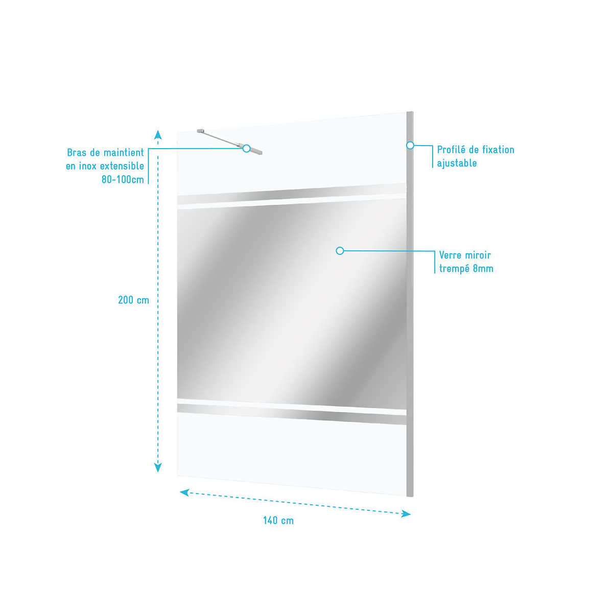 Caractéristiques Paroi en verre avec bande miroir pour douche à l'italienne Profilé de fixation murale ajustable Bras de maintient en inox extensible 80-100 cm Verre trempé transparent 8 mm avec bande miroir Dimensions 140x200 cm PLUS PRODUIT: Miroir, miroir…Dis moi que ma salle de bain est la plus belle. Facile à installer et à entretenir, cette paroi de douche fera son effet dans votre salle d'eau. Garantie 2 ans Pièces uniquement. Dans un souci de qualité mais aussi de sécurité nos produits répondent à toutes les normes Européennes en vigueur. Que ce soit en terme de sécurité en cas de casse, d'entretien de nos produits ou de la durée de vie de ces derniers, nos produits remplissent tous les critères. Verre trempé : Le verre trempé est un verre qui a subi un traitement afin d’améliorer ses propriétés. Nous utilisons la trempe thermique qui consiste à porter le verre à très haute température (environ à 700 °C), puis de le refroidir rapidement. Ce processus favorise l'apparition de tensions en profondeur et celle de la compression à la surface du verre. Tout cela a pour effet l’amélioration de sa résistance aux chocs. Il est de 2 à 5 fois plus résistant que le verre simple. Mais aussi diminue grandement la dangerosité du verre car en cas de casse le verre explose en de petits morceaux et non pas en de grands pans tranchants. Pour le reste il conserve les mêmes propriétés que le verre classique Norme harmonisée : EN14428:2004 Certification Européenne: Aptitude au nettoyage : EN14428 :2004+A1:2008 Clause 4.2 Résistance à l’impact / Propriétés d’éclatement: EN14428:2004+A1:2008 Clause 4.3 Durabilité : EN14428:2004+A1:2008 Clause 4.4 MyShowerRoom c’est aussi la garantie de durabilité : Nous garantissons un stocks de pièces détachées d’au moins 5 ans Notre visserie est en acier inoxydable ce qui est une garantie anticorrosion Garantie 2 ans pièces uniquement Cocorico ! MyShowerRoom est une entreprise Française et toute la conception de nos produits est également Française. Ce qui est un véritable plus pour être au plus près de ses clients et avoir une meilleure connaissance de leurs attentes. Qui sommes nous L’HISTOIRE DE MYSHOWERROOM Nous avons créé MyShowerRoom en 2003 avec l’ambition de démocratiser le design et l’innovation dans la salle de bain pour faire de cette pièce un lieu à part entière, un véritable lieu d’histoires à vivre pour toute la famille. Nos cabines de douche et meubles de salle de bain dans l’ère du temps à des tarifs très accessibles. Nos nombreux brevets garantissent l’originalité de notre gamme de cabines de douches. Et nos ingénieurs mettent en œuvre tout leur savoir-faire et toutes les technologies innovantes au service d’une simplicité d’installation et d’utilisation incomparable pour tous. ÊTRE BIENVEILLANT AVEC NOS CLIENTS Notre service client a un objectif : rendre nos clients heureux. Pour cela nous veillons à répondre dans les 24h aux demandes clients. Mais aussi de toujours apporter une solution et entière satisfaction à nos clients. CONSTRUIRE DES PRODUITS TOUJOURS PLUS PERFORMANTS Nos ingénieurs, ainsi que nos équipes terrain consacrent tous leurs efforts à créer des produits adaptés à vos besoins, et toujours plus innovants grâce à nos technologies. Notre objectif est d’être votre unique interlocuteur pour tous vos projets de salle de bain. CONCRÉTISER LES RÊVES DE CHACUN Un projet de salle de bain ? Nous le réalisons ! Lieu de détente et de relaxation par excellence, la salle de bain est une des pièces maîtresse de la maison. Chez MyShowerRoom, nous mettons tout en oeuvre afin que ce rêve devienne réalité. PROPOSER UNE GAMME COMPLÈTE DE PRODUITS Nous vous proposons grâce à notre boutique en ligne une gamme complète de produits Made in MyShowerRoom pour équiper, et accessoiriser votre salle de bain. Un catalogue que nous renouvelons régulièrement avec les dernières technologies MyShowerRoom. APPORTER UNE EXPERTISE HUMAINE Parce que l’humain passe avant tout, nous travaillons avec les meilleurs experts. La satisfaction de nos clients est notre seule et unique priorité. Chaque problème a une solution, et c’est dans cette optique que nous avons mis en place un chat pour échanger directement avec nos équipes. NOTRE CENTRE LOGISTIQUE 11 000 m² d’entrepôt 7000 palettes en stock 1 800 colis traités par jour Plus de 260 préparations de commandes quotidiennes 12 quais de chargement/déchargement CONSEILS & VENTES Une équipe disponible 5 jours sur 7 pour vous accompagner dans vos achats. LIVRAISON GRATUITE Pour toute commande sur le site MyShowerRoom, la livraison est gratuite dans toute la France. UNE GARANTIE DE QUALITÉ Grâce à nos produits brevetés vous bénéficiez de produits uniques. Référence produit: FAC290 Retrouvez plus d'informations produit et des conseils de montage sur le site Aurlane. Remarques importantes: Ces colis sont volumineux, la livraison est effectuée par transporteur spécialisé en bas de chez vous. Les chauffeurs ne sont pas habilités à porter la marchandise, mais uniquement à la décharger. Pas de livraison à l'étage. L'adresse de livraison doit être accessible en camion poids lourd. Dans le cas contraire la marchandise sera mise à disposition au dépôt le plus proche (distance non garantie). Les rendez-vous sont gérés directement par les transporteurs. Attention à bien contrôler la marchandise à réception pour éviter tous litiges.