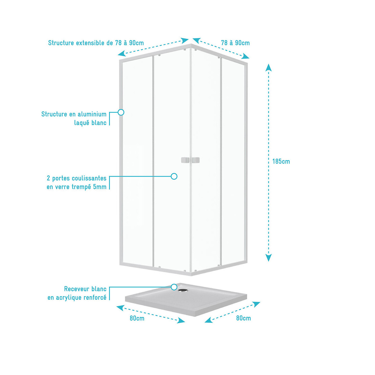Caractéristiques : Structure en aluminium laqué blanc Deux portes coulissante en verre trempé 5mm Receveur blanc en acrylique renforcé Structure extensible de 78 à 90cm Dimensions : Portes coulissantes : 78-90x190 cm Receveur : 80x80 cm Plus produit : Profilés ajustables pour s'adapter à un maximum de surface La simplicité oui mais avec style Caractéristiques du receveur WHITENESS II 80: Receveur en acrylique blanc Faible épaisseur : 4 cm À poser ou à encastrer dans le sol - bonde 90 mm non fournie Dimensions receveur: 80x80x4 cm Réference du produit: PACF030 Désignation du produit: WHITY SLIDE Garantie 2 ans pièces et non main d'oeuvre. Verre trempé : Le verre trempé est un verre qui a subi un traitement afin d’améliorer ses propriétés. Nous utilisons la trempe thermique qui consiste à porter le verre à très haute température (environ à 700 °C), puis de le refroidir rapidement. Ce processus favorise l'apparition de tensions en profondeur et celle de la compression à la surface du verre. Tout cela a pour effet l’amélioration de sa résistance aux chocs. Il est de 2 à 5 fois plus résistant que le verre simple. Mais aussi diminue grandement la dangerosité du verre car en cas de casse le verre explose en de petits morceaux et non pas en de grands pans tranchants. Pour le reste il conserve les mêmes propriétés que le verre classique Norme harmonisée : EN14428:2004 Certification Européenne: Aptitude au nettoyage : EN14428 :2004+A1:2008 Clause 4.2 Résistance à l’impact / Propriétés d’éclatement: EN14428:2004+A1:2008 Clause 4.3 Durabilité : EN14428:2004+A1:2008 Clause 4.4 MyShowerRoom c’est aussi la garantie de durabilité : Nous garantissons un stocks de pièces détachées d’au moins 5 ans Notre visserie est en acier inoxydable ce qui est une garantie anticorrosion Garantie 2 ans pièces uniquement Cocorico ! MyShowerRoom est une entreprise Française et toute la conception de nos produits est également Française. Ce qui est un véritable plus pour être au plus près de ses clients et avoir une meilleure connaissance de leurs attentes. Qui sommes nous L’HISTOIRE DE MYSHOWERROOM Nous avons créé MyShowerRoom en 2003 avec l’ambition de démocratiser le design et l’innovation dans la salle de bain pour faire de cette pièce un lieu à part entière, un véritable lieu d’histoires à vivre pour toute la famille. Nos cabines de douche et meubles de salle de bain dans l’ère du temps à des tarifs très accessibles. Nos nombreux brevets garantissent l’originalité de notre gamme de cabines de douches. Et nos ingénieurs mettent en œuvre tout leur savoir-faire et toutes les technologies innovantes au service d’une simplicité d’installation et d’utilisation incomparable pour tous. ÊTRE BIENVEILLANT AVEC NOS CLIENTS Notre service client a un objectif : rendre nos clients heureux. Pour cela nous veillons à répondre dans les 24h aux demandes clients. Mais aussi de toujours apporter une solution et entière satisfaction à nos clients. CONSTRUIRE DES PRODUITS TOUJOURS PLUS PERFORMANTS Nos ingénieurs, ainsi que nos équipes terrain consacrent tous leurs efforts à créer des produits adaptés à vos besoins, et toujours plus innovants grâce à nos technologies. Notre objectif est d’être votre unique interlocuteur pour tous vos projets de salle de bain. CONCRÉTISER LES RÊVES DE CHACUN Un projet de salle de bain ? Nous le réalisons ! Lieu de détente et de relaxation par excellence, la salle de bain est une des pièces maîtresse de la maison. Chez MyShowerRoom, nous mettons tout en oeuvre afin que ce rêve devienne réalité. PROPOSER UNE GAMME COMPLÈTE DE PRODUITS Nous vous proposons grâce à notre boutique en ligne une gamme complète de produits Made in MyShowerRoom pour équiper, et accessoiriser votre salle de bain. Un catalogue que nous renouvelons régulièrement avec les dernières technologies MyShowerRoom. APPORTER UNE EXPERTISE HUMAINE Parce que l’humain passe avant tout, nous travaillons avec les meilleurs experts. La satisfaction de nos clients est notre seule et unique priorité. Chaque problème a une solution, et c’est dans cette optique que nous avons mis en place un chat pour échanger directement avec nos équipes. NOTRE CENTRE LOGISTIQUE 11 000 m² d’entrepôt 7000 palettes en stock 1 800 colis traités par jour Plus de 260 préparations de commandes quotidiennes 12 quais de chargement/déchargement CONSEILS & VENTES Une équipe disponible 5 jours sur 7 pour vous accompagner dans vos achats. LIVRAISON GRATUITE Pour toute commande sur le site MyShowerRoom, la livraison est gratuite dans toute la France. UNE GARANTIE DE QUALITÉ Grâce à nos produits brevetés vous bénéficiez de produits uniques. Référence produit: PACF030 Retrouvez plus d'informations produit et des conseils de montage sur le site Aurlane. Remarques importantes: Ces colis sont volumineux, la livraison est effectuée par transporteur spécialisé en bas de chez vous. Les chauffeurs ne sont pas habilités à porter la marchandise, mais uniquement à la décharger. Pas de livraison à l'étage. L'adresse de livraison doit être accessible en camion poids lourd. Dans le cas contraire la marchandise sera mise à disposition au dépôt le plus proche (distance non garantie). Les rendez-vous sont gérés directement par les transporteurs. Attention à bien contrôler la marchandise à réception pour éviter tous litiges.