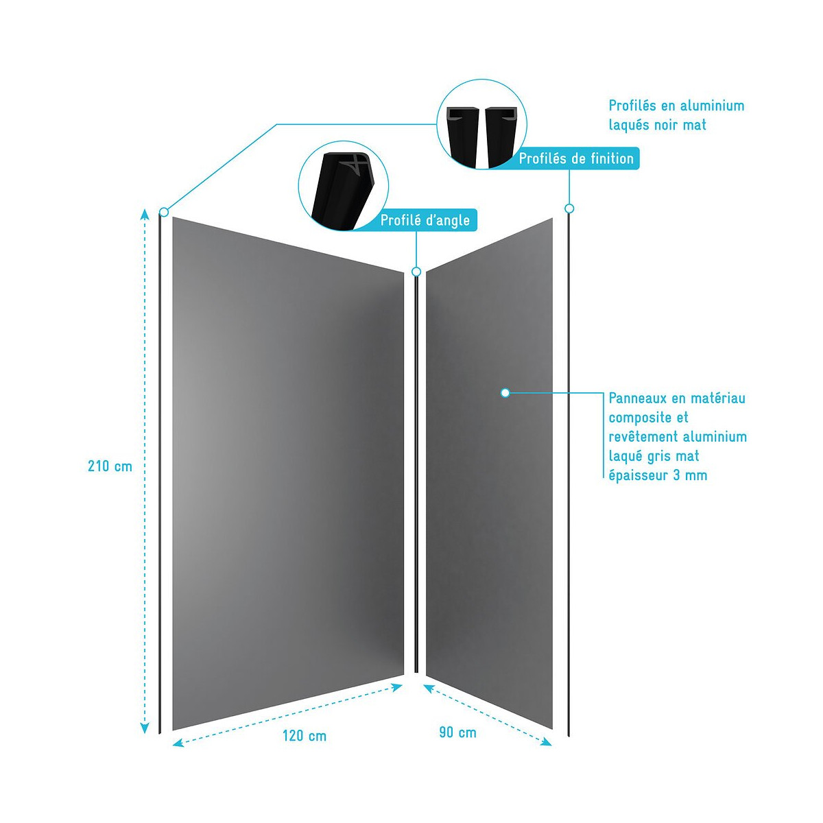 Ce pack comprend deux panneaux muraux (dont un de 120x210 et un de 90x210) WALL'IT GRIS + des profiles noir mat Rénover sa douche en quelques heures c’est facile avec les panneaux muraux et en plus c’est très déco! Vous désirez habiller votre salle de bains facilement et sans utiliser de carrelage : Nous vous propose les panneaux muraux WALL'IT . Une gamme de panneaux de couleur unis qui s’adapteront parfaitement à votre intérieur. Idéal dans le cadre de rénovation, les panneaux muraux WALL'it peuvent se poser directement sur la faïence ou sur votre mur brut. Parfaitement étanches ils trouveront une place privilégiée dans votre douche. Plus produit: La pose est extrêmement facile et rapide et ne nécessite pas de gros outillage. Les travaux sont bien moins contraignants et salissants que la pose du carrelage. Tous nos panneaux sont garantis 10 ans Matériaux: Les panneaux WALL'IT sont des matériaux composites formés d’un noyau en polyéthylène et d’une surface en aluminium collées sous haute pression. Ils sont ultra résistants à l’eau, totalement étanches et imputrescibles. Installation: Les panneaux muraux sont collés à l’aide de mastic PU ou de silicone pour garantir le maintien et l’étanchéité de votre douche. Des bandes de ruban adhésif double face permettent de maintenir le panneau le temps du séchage de la colle. Composition du kit pour installation en angle: Caractéristiques techniques des panneaux : Panneaux en matériaux composite et revêtement aluminium laqué gris mat ép. 3mm Profilés en aluminium anodisés noir mat (finitions + angle) Dimensions des deux panneaux : 210x120 cm 210x90 cm Réference du produit: PACP250 Désignation du produit: WALL'IT GRIS 90x120 Garantie 2 ans pièces et non main d'oeuvre. Profilé noir mat thermolaqué : Le thermolaquage est une technique de traitement spécifique réservé aux matériaux en métal ou en aluminium brut. On projette de la peinture en poudre chargée en électricité statique qui va se déposer sur toute la surface des profilés. Cette technique de pulvérisation en poudre , qui s’appelle projection électrostatique ou poudrage électrostatique, permet d'avoir un revêtement complètement uniforme sur tous les profilés. Ce type de traitement dispense l’utilisation de produits chimiques nocifs pour la santé et l’environnement comme les solvants. Après avoir été recouverte de poudre, la pièce doit passer dans un four où elle sera chauffée pendant 20 minutes à 200°C. Les avantages du thermolaquage : Cette technique possède de nombreux avantage, qui sont La surface peinte possède une dureté supérieure ce qui a pour conséquence une résistance aux chocs accrue Le thermolaquage a une meilleure résistance à la corrosion La couleur des profilés thermolaqués résiste mieux au vieillisement et tout autres élément tel que l'humidité etc. Les profilés thermolaqués présentent une meilleure finition, fini les coulures de peinture et défauts d'aspect, avec cette technique la surface est uniforme Sans solvant c'est un véritable plus pour la santé Mais aussi plus écologique (pas de solvants) Dans un souci de qualité mais aussi de sécurité nos produits répondent à toutes les normes Européennes en vigeur. Que ce soit en terme de sécurité en cas de casse, d'entretien de nos produits ou de la durée de vie de ces derniers, nos produits remplissent tous les critères. Verre trempé : Le verre trempé est un verre qui a subi un traitement afin d’améliorer ses propriétés. Nous utilisons la trempe thermique qui consiste à porter le verre à très haute température (environ à 700 °C), puis de le refroidir rapidement. Ce processus favorise l'apparition de tensions en profondeur et celle de la compression à la surface du verre. Tout cela a pour effet l’amélioration de sa résistance aux chocs. Il est de 2 à 5 fois plus résistant que le verre simple. Mais aussi diminue grandement la dangerosité du verre car en cas de casse le verre explose en de petits morceaux et non pas en de grands pans tranchants. Pour le reste il conserve les mêmes propriétés que le verre classique Norme harmonisée : EN14428:2004 Certification Européenne: Aptitude au nettoyage : EN14428 :2004+A1:2008 Clause 4.2 Résistance à l’impact / Propriétés d’éclatement: EN14428:2004+A1:2008 Clause 4.3 Durabilité : EN14428:2004+A1:2008 Clause 4.4 MyShowerRoom c’est aussi la garantie de durabilité : Nous garantissons un stocks de pièces détachées d’au moins 5 ans Notre visserie est en acier inoxydable ce qui est une garantie anticorrosion Garantie 2 ans pièces uniquement Cocorico ! MyShowerRoom est une entreprise Française et toute la conception de nos produits est également Française. Ce qui est un véritable plus pour être au plus près de ses clients et avoir une meilleure connaissance de leurs attentes. Qui sommes nous L’HISTOIRE DE MYSHOWERROOM Nous avons créé MyShowerRoom en 2003 avec l’ambition de démocratiser le design et l’innovation dans la salle de bain pour faire de cette pièce un lieu à part entière, un véritable lieu d’histoires à vivre pour toute la famille. Nos cabines de douche et meubles de salle de bain dans l’ère du temps à des tarifs très accessibles. Nos nombreux brevets garantissent l’originalité de notre gamme de cabines de douches. Et nos ingénieurs mettent en œuvre tout leur savoir-faire et toutes les technologies innovantes au service d’une simplicité d’installation et d’utilisation incomparable pour tous. ÊTRE BIENVEILLANT AVEC NOS CLIENTS Notre service client a un objectif : rendre nos clients heureux. Pour cela nous veillons à répondre dans les 24h aux demandes clients. Mais aussi de toujours apporter une solution et entière satisfaction à nos clients. CONSTRUIRE DES PRODUITS TOUJOURS PLUS PERFORMANTS Nos ingénieurs, ainsi que nos équipes terrain consacrent tous leurs efforts à créer des produits
